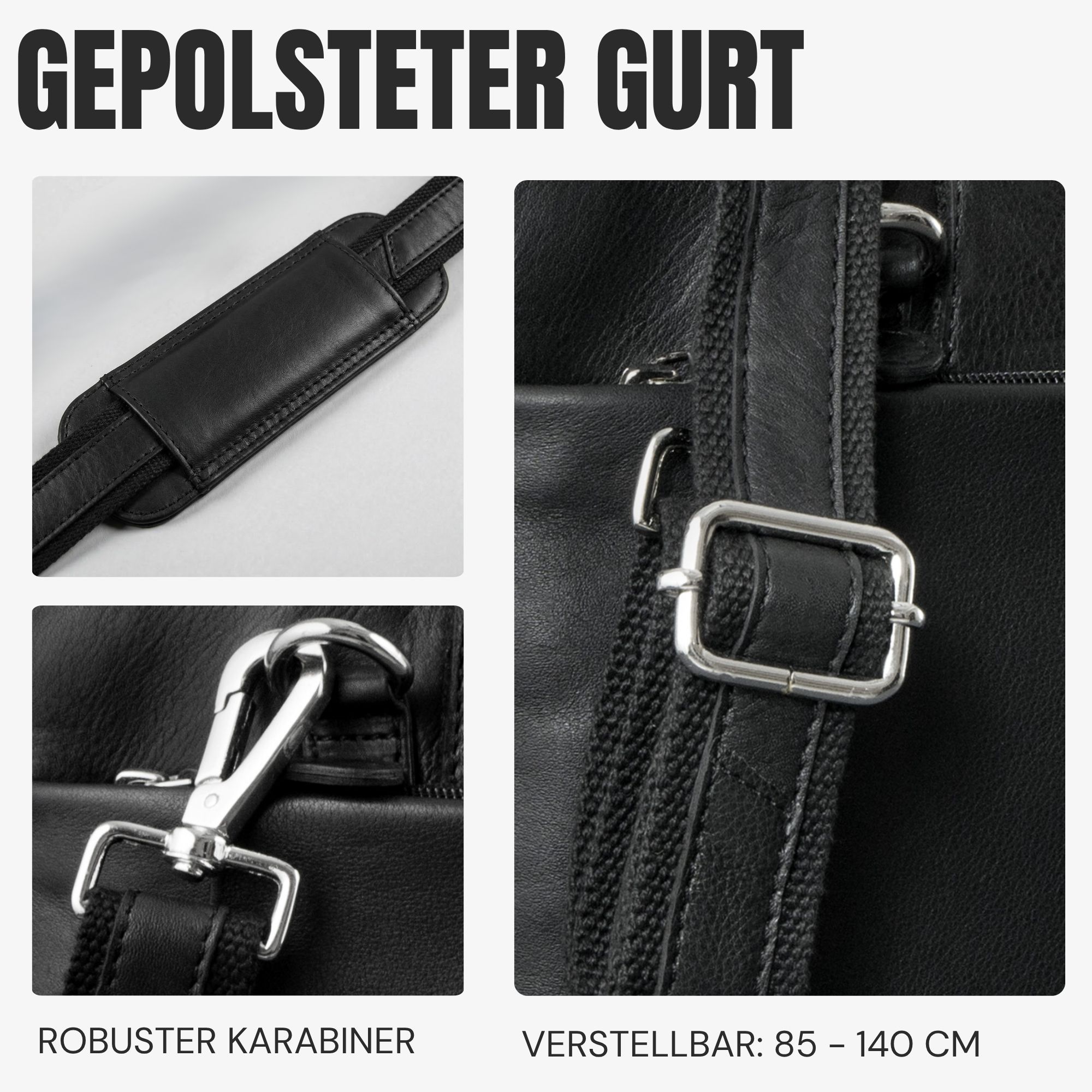 - Flexibles Tragen als Laptoptasche Herren Leder dank stabilem Tragehenkel und abnehmbarem Schultergurt (ca. 85 – 140 cm) mit robustem Metallkarabiner