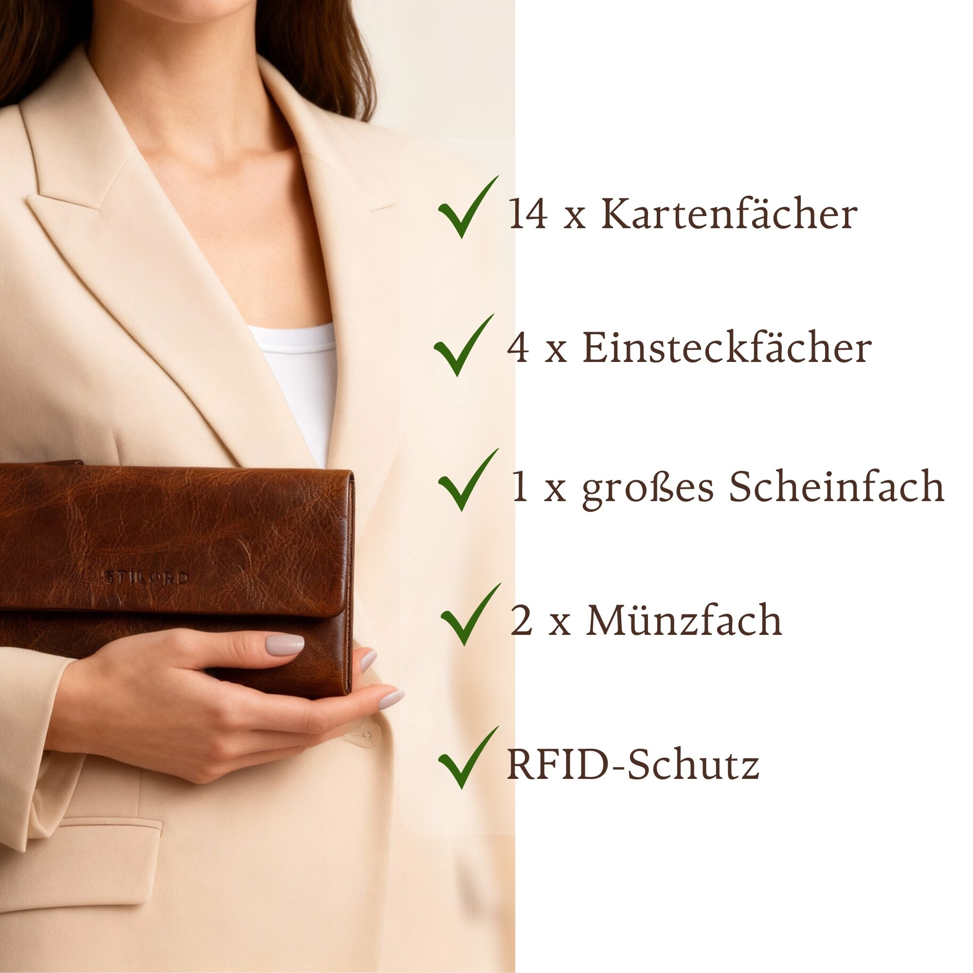 Für Frauen, die Wert auf stilvolle Übersicht legen: Die elegante, aufklappbare Damen Geldbörse Leder mit Druckknopf bietet viel Platz für Karten, Bargeld und Belege. Mit 14 Kartenfächern inklusive Netzfach, vier Einsteckfächern und einem Scheinfach bleibt alles ordentlich sortiert und sofort griffbereit. Übersichtlich aufklappbar und sicher verschlossen durch einen hochwertigen Druckknopf – angenehm weich verarbeitet, kantenfrei vernäht und ideal als Geldbörse Damen groß viele Fächer Leder für Frauen, die durchdachte Organisation und hochwertige Haptik lieben. Das extra große Münzfach auf der Rückseite mit Reißverschluss ermöglicht schnellen Zugriff auf Kleingeld, während das weiche, natürliche Leder einen edlen Vintage-Charakter verleiht. Eine lange Geldbörse Damen Echt Leder, die Funktionalität und feminine Eleganz harmonisch verbindet.