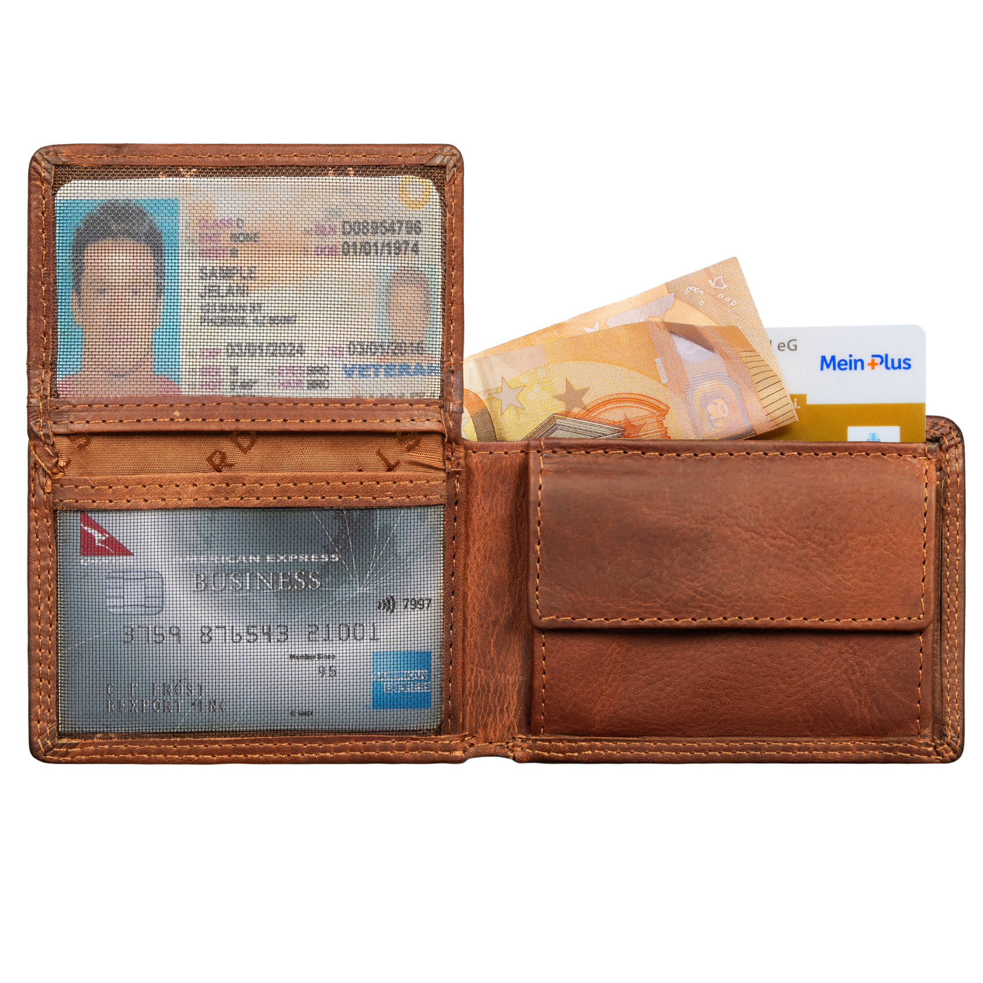 - Ideale Aufteilung: 4 x EC Karten-Fächer, 1 x Kleingeld-Fach mit Druckknopf, 1 x Geldscheinfach, 2 x Netzfach | Querformat