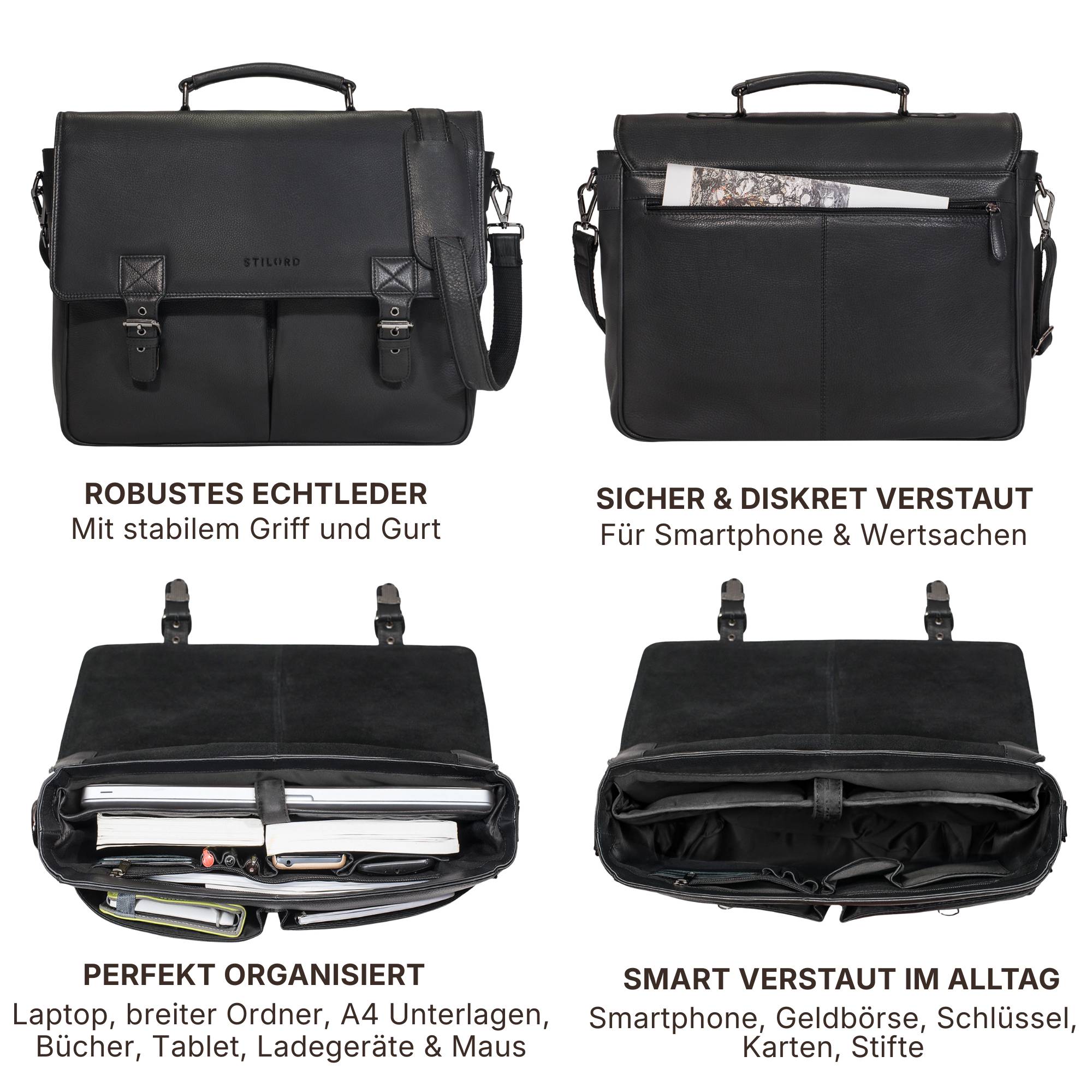 • Sicherer Verschluss: Aktentasche Herren Leder groß mit Überschlag & mit zwei robusten Schnallen