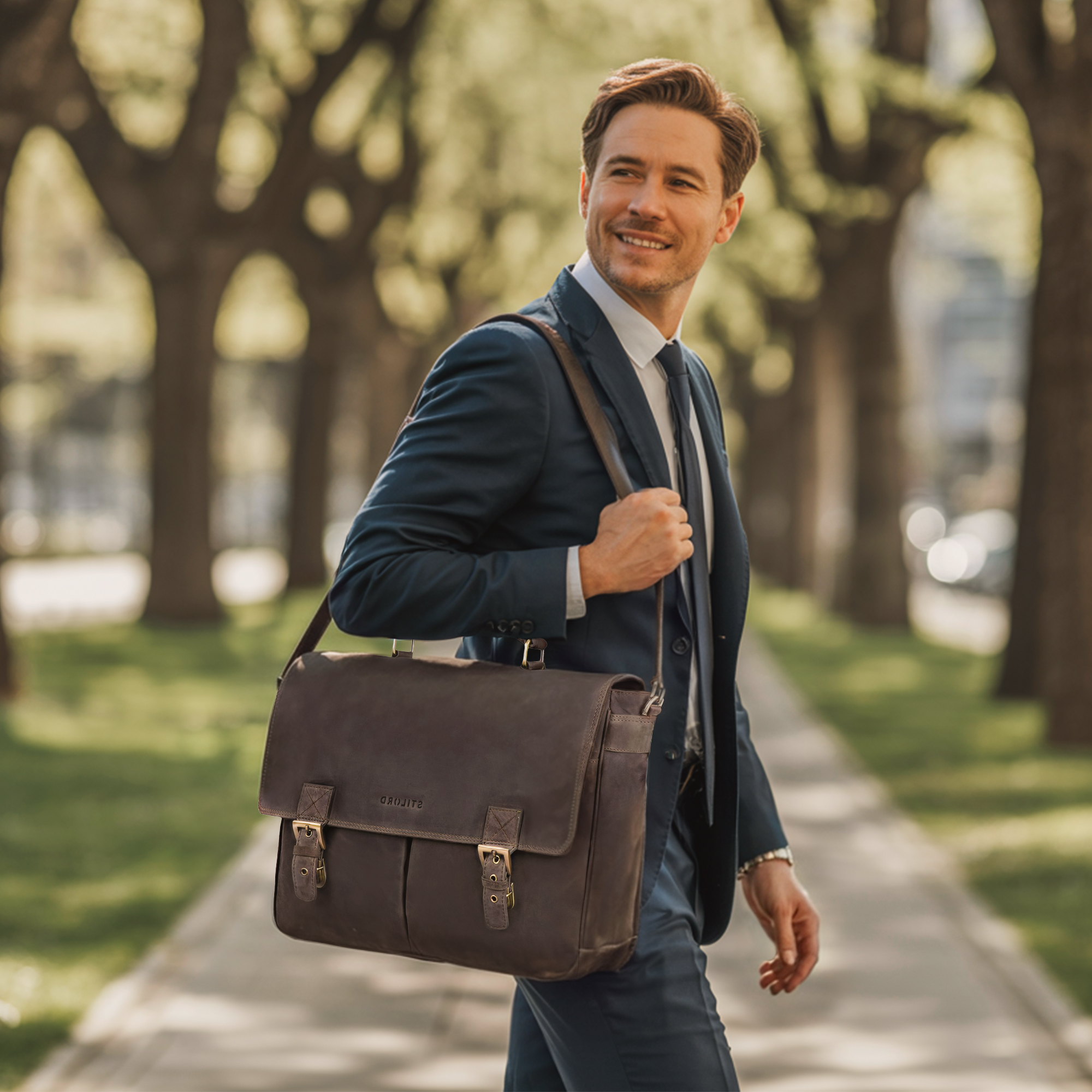 - AKTENTASCHE MIT KOMFORT: Die Aktentasche Herren Leder kombiniert klassisches Design mit praktischer Handhabung. Der Überschlag mit zwei Schnallenverschlüssen sorgt für sicheren Halt, während ein stabiler Griff und abnehmbarer, gepolsterter Schulterriemen (90 - 140 cm) verschiedene Trageoptionen ermöglichen.
