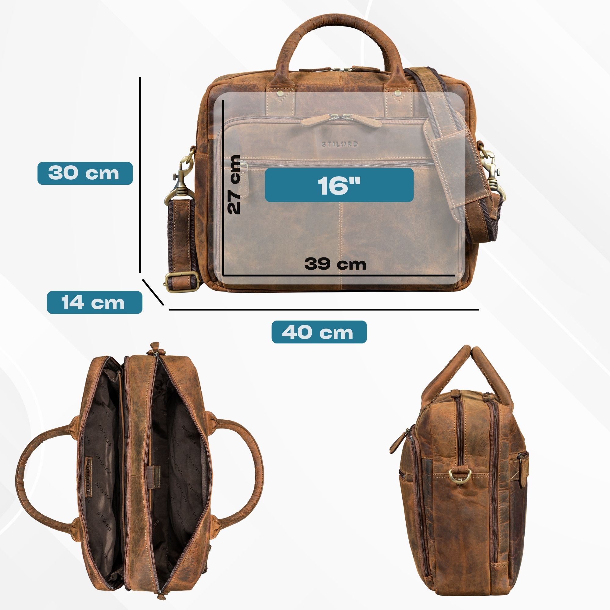 - DETAILS: Maße: ca. 40 x 14 x 30 cm | Gewicht: 1500 g | Modell: "Jerome" | Material: echtes Rindsleder | Marke: STILORD | Kompabilität: Laptopfach 27 x 39 cm für 16 Zoll Laptops und 16 Zoll MacBook