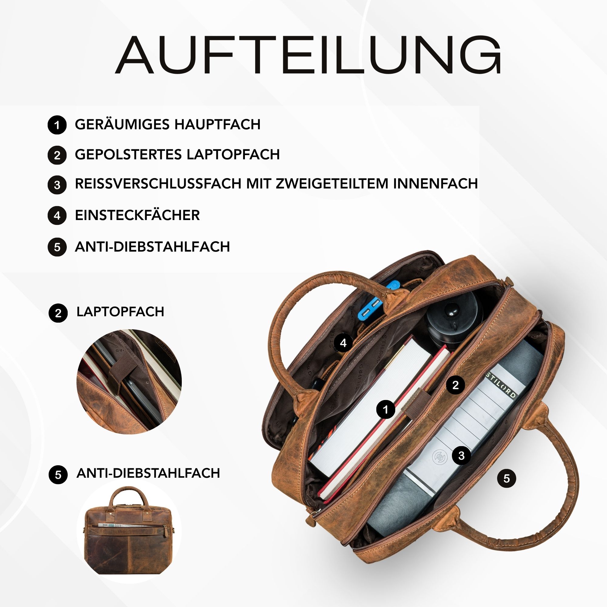 - ORGANISATION FÜR TECHNIK & DOKUMENTE: Mit großem Hauptfach für breite DIN A4 Aktenordner und gepolstertem Laptopfach (15,6 Zoll), zweigeteiltem Innenfach, mehreren Reißverschluss- und Einsteckfächern sowie einem Anti-Diebstahlfach bietet die Ledertasche Herren im Businessalltag perfekte Übersicht.