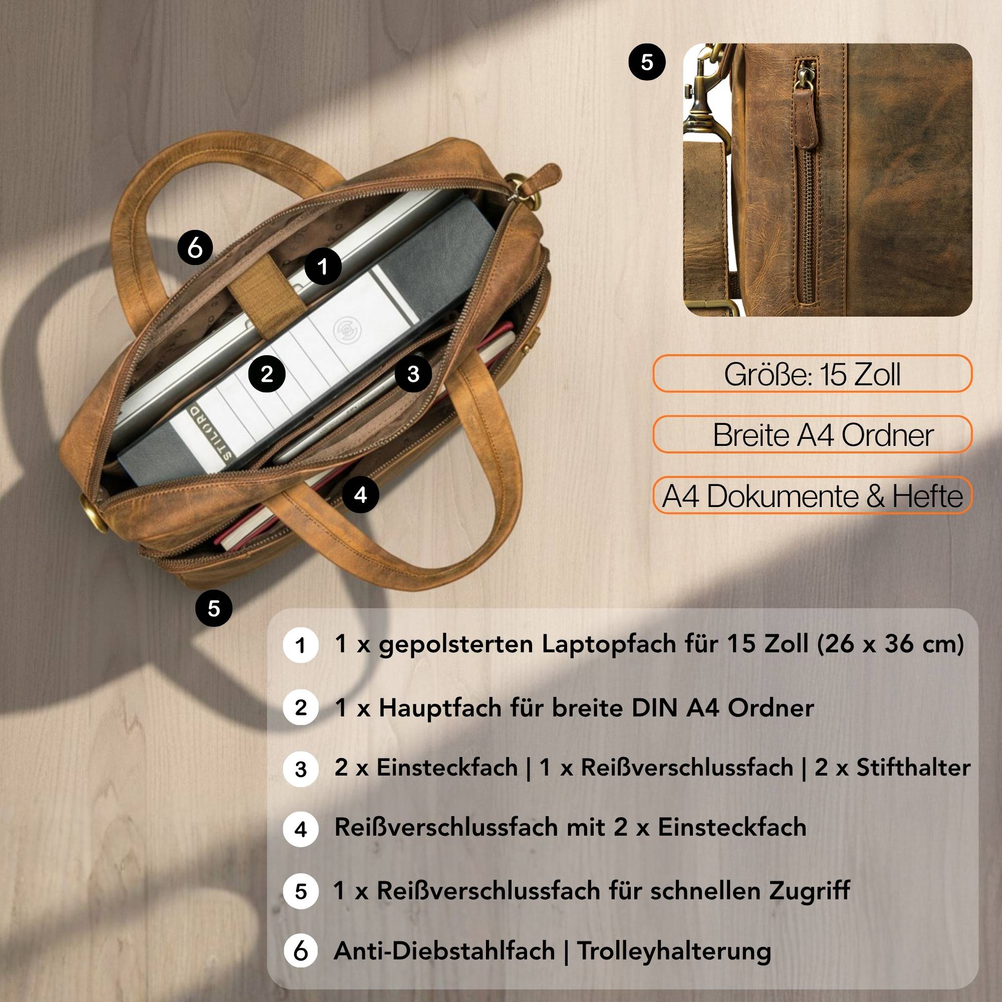 - FÜR MAXIMALE PRODUKTIVITÄT: Großes Hauptfach mit Platz für A4 Ordner, ergänzt durch Einsteckfächer, Reißverschlussfächer und Stiftfächer für übersichtliche Organisation. Vielseitig nutzbar als Aktentasche Leder oder Laptop Schultertasche Herren Leder mit robusten Tragegriffen und verstellbarem Schultergurt 90 bis 150 cm.