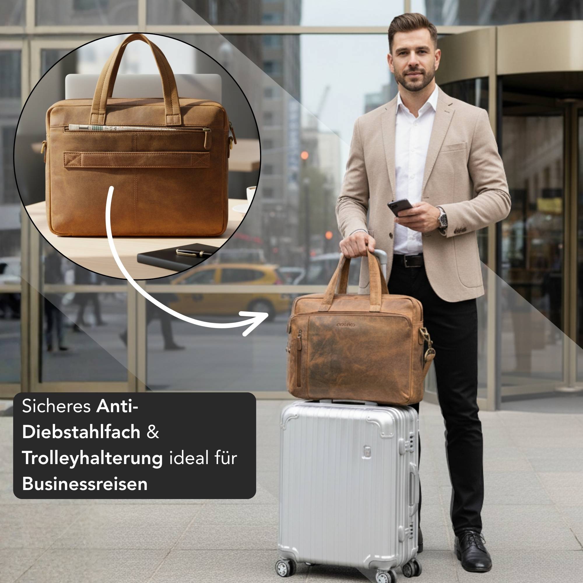 - Rückseitiges Anti-Diebstahlfach & Trolleyhalterung auf der Rückseite der Umhängetasche Herren Leder für zusätzliche Sicherheit im dichten Berufsverkehr und in vollen Zügen