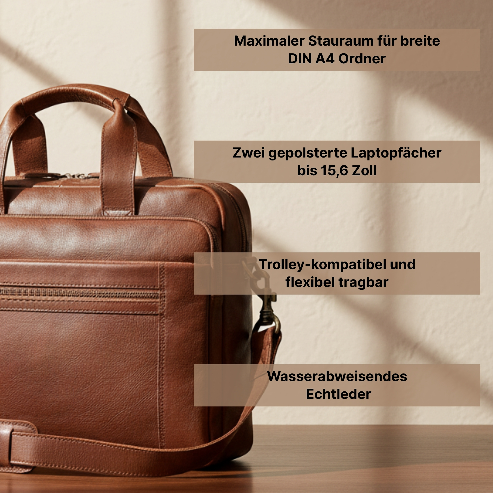 Die geräumige Leder Laptoptasche Herren bietet Raum für alles, was den Tag strukturiert: ein gepolstertes Laptopfach für Geräte bis 15,6 Zoll, separate Fächer für Dokumente, Smartphone und Zubehör sowie clever durchdachte Aufbewahrungsmöglichkeiten. Die Trolley-Halterung, robusten Griffe und der verstellbare Schultergurt garantieren flexible und komfortable Transportmöglichkeiten. Ob im Büro, auf Reisen oder im Meeting – "Alberto" macht jeden Arbeitstag eleganter und strukturierter.