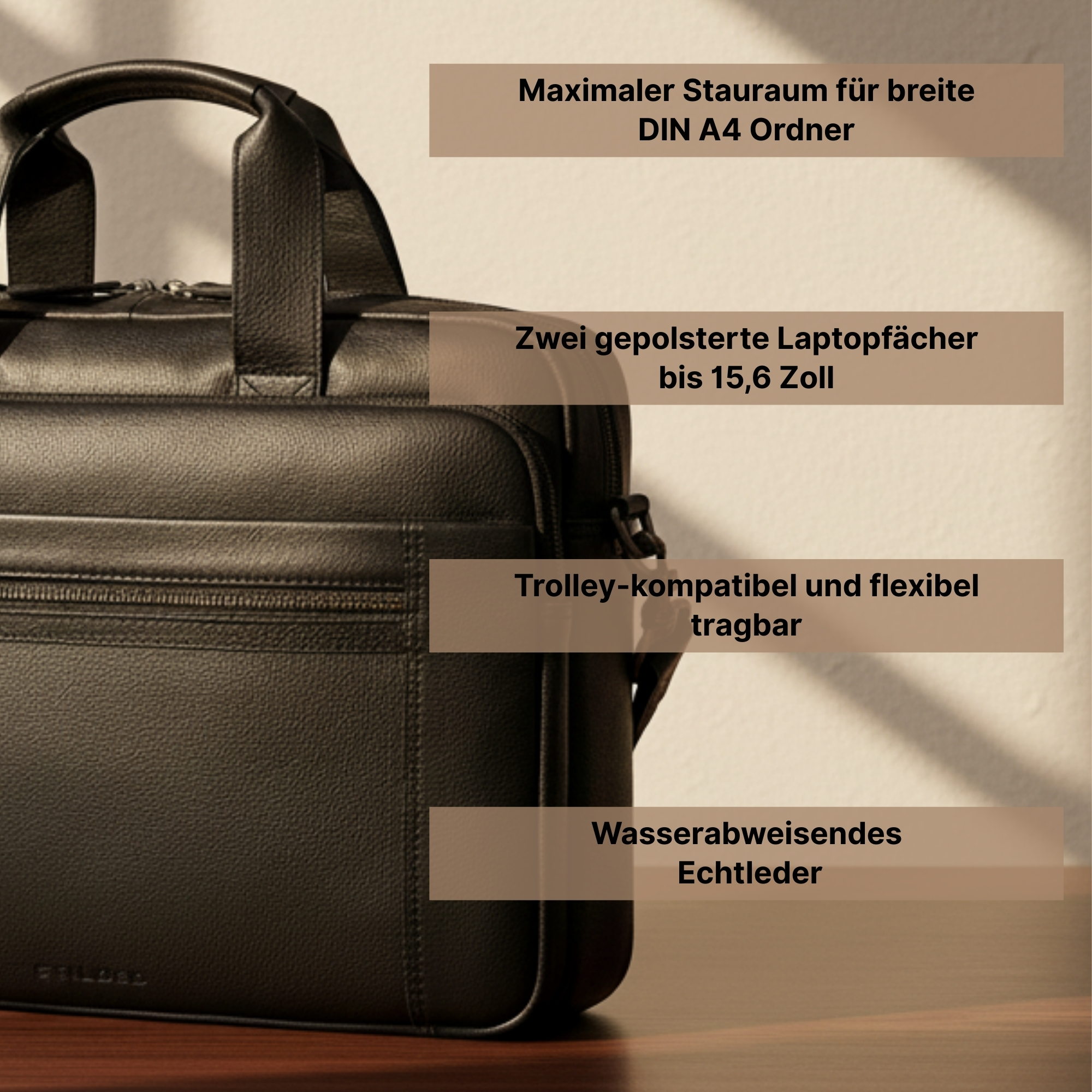 Die geräumige Leder Laptoptasche Herren bietet Raum für alles, was den Tag strukturiert: ein gepolstertes Laptopfach für Geräte bis 15,6 Zoll, separate Fächer für Dokumente, Smartphone und Zubehör sowie clever durchdachte Aufbewahrungsmöglichkeiten. Die Trolley-Halterung, robusten Griffe und der verstellbare Schultergurt garantieren flexible und komfortable Transportmöglichkeiten. Ob im Büro, auf Reisen oder im Meeting – "Alberto" macht jeden Arbeitstag eleganter und strukturierter.