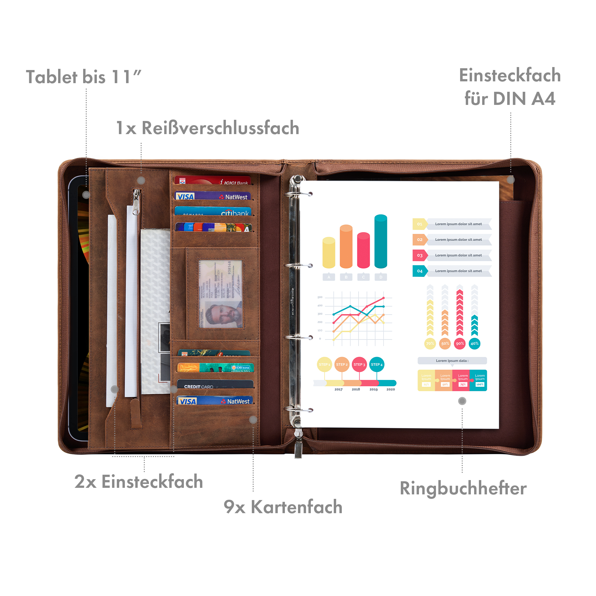 - Aufteilung: 1x Ringbuchhefter | 1x Tabletfach (30x20cm) für Geräte bis 11 Zoll | 1x DIN A4 Einsteckfach | 2x Einsteckfach | 1x Reißverschlussfach | 9x Kartenfach