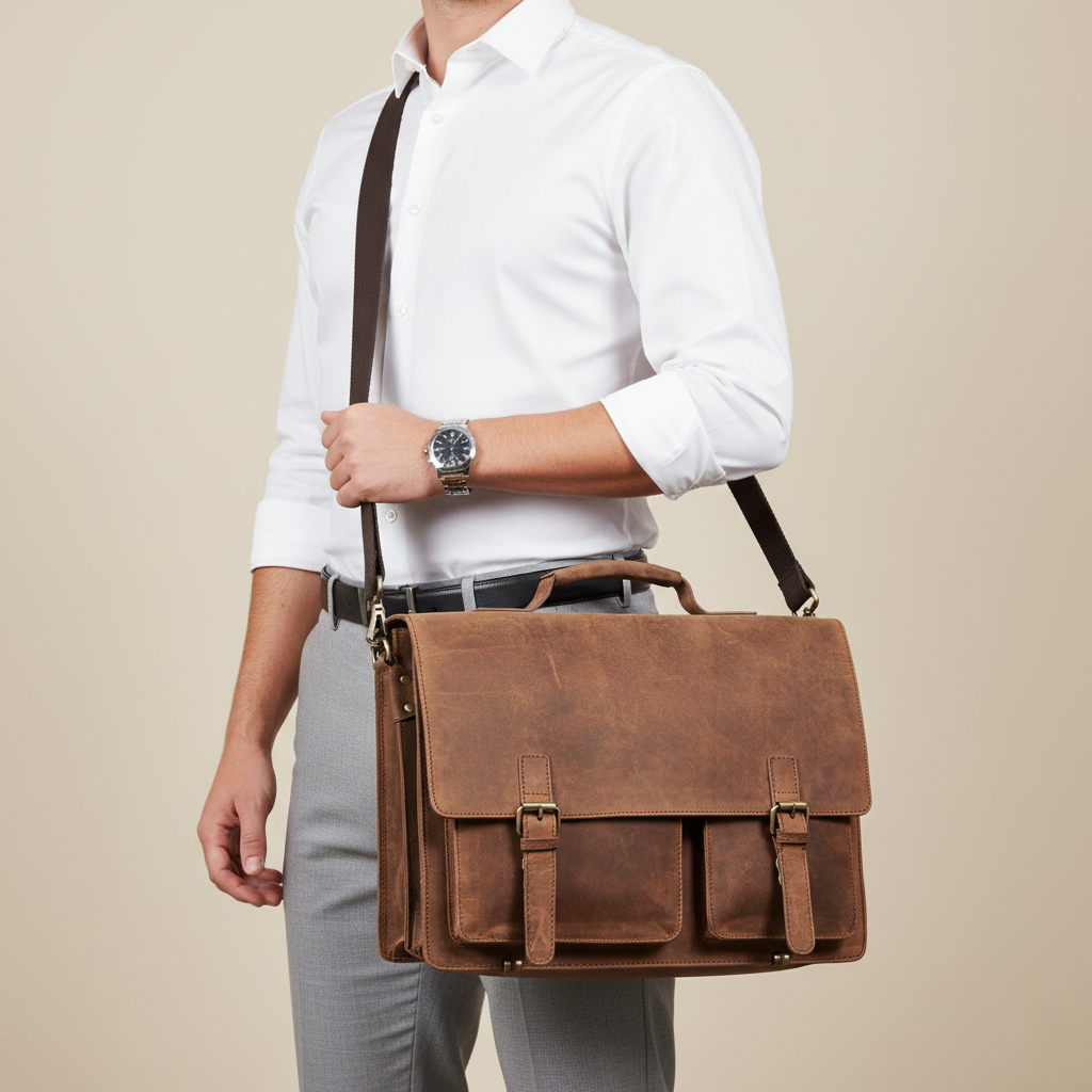 Ob als Vintage Lehrertasche in der Schule, elegante Businesstasche im Büro oder als aufsteckbare Aktentasche für Geschäftsreisen - "Clifford" ist eine vielseitige Ledertasche für Herren mit Stil!