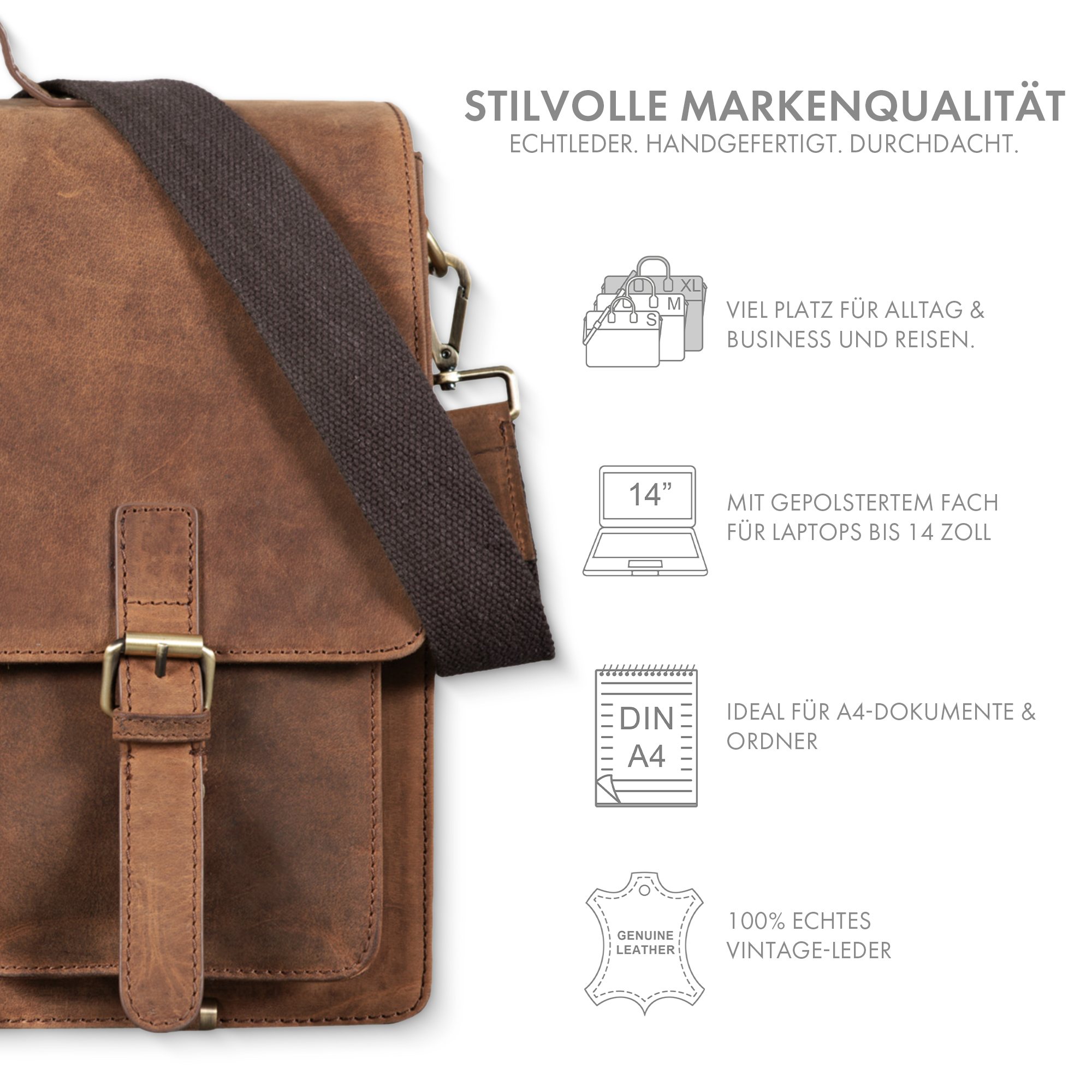 • Die große Arbeitstasche bietet Stauraum für einen großen DIN A4 Aktenorder, Bücher und 14 Zoll Laptops | vielseitige Tragemöglichkeiten dank verstell- und abnehmbarem Schultergurt (75 - 140 cm | 4 cm breit): als Vintage Aktentasche, Leder Businesstasche oder große Umhängetasche tragbar