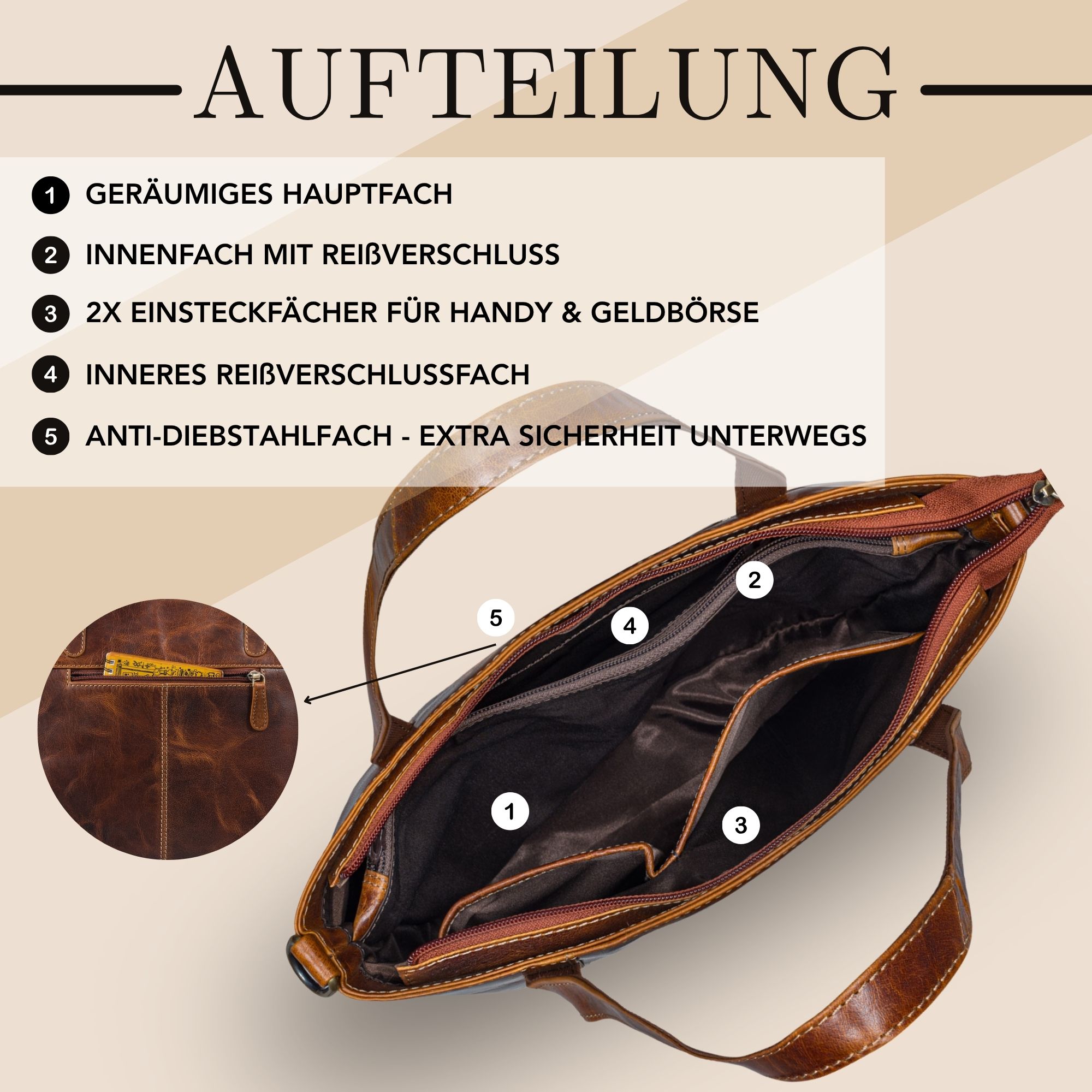 - 2 x Einsteckfächer & 1 x Reißverschlussfach innen – sicherer Platz für Smartphone, Schlüssel oder Make-up