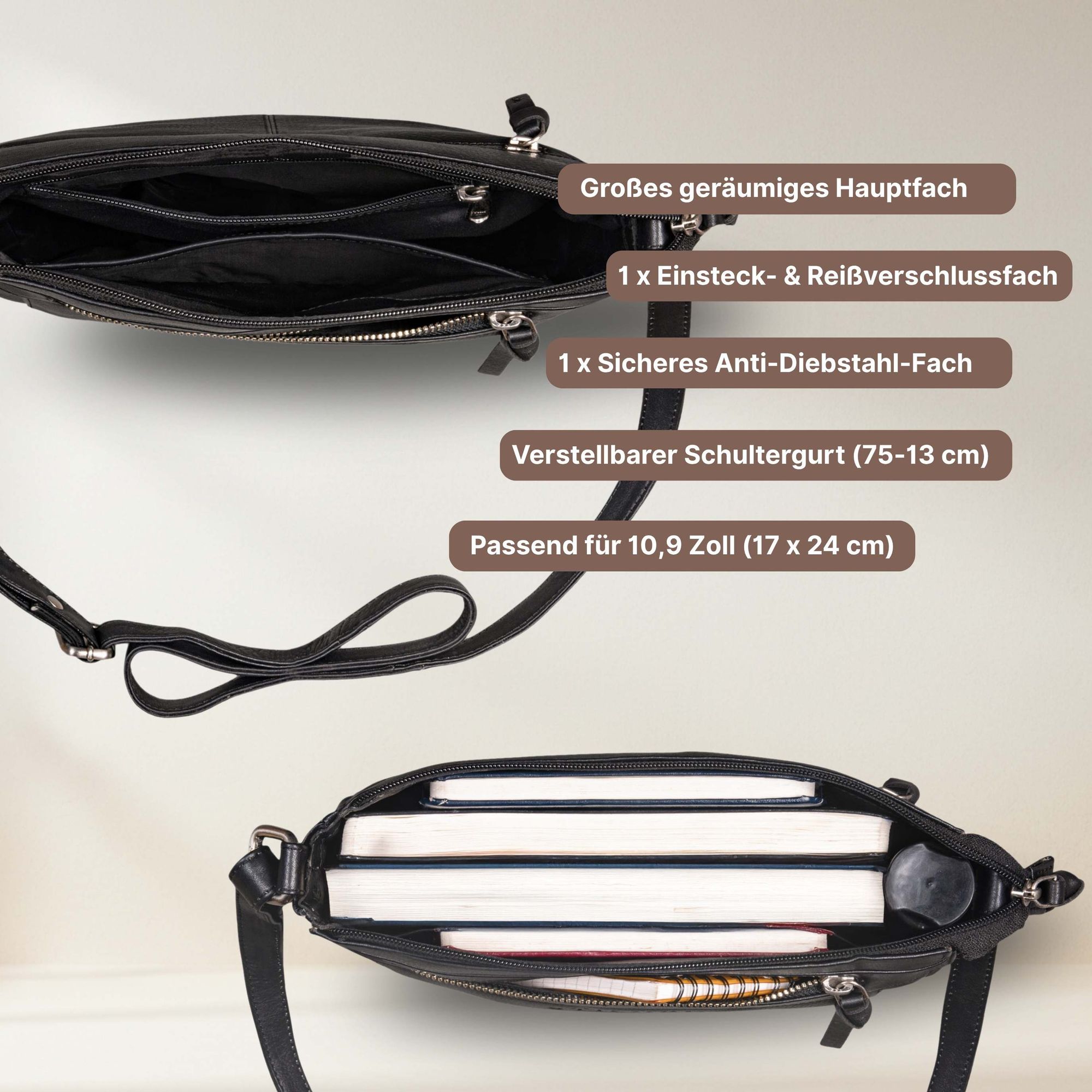- MAXIMAL FLEXIBEL, MAXIMAL SICHER: Verstauen Sie problemlos Make-Up, Smartphone, 10,9 Zoll Tablet, Portemonnaie, eine 0,5l Flasche in Ihrer Umhängetasche Damen Leder klein | der verstellbare Gurt (75 - 130 cm) sorgt für Komfort, während das Anti-Diebstahl-Reißverschlussfach der Damen Ledertasche klein für mehr Sicherheit Ihrer Wertsachen sorgt