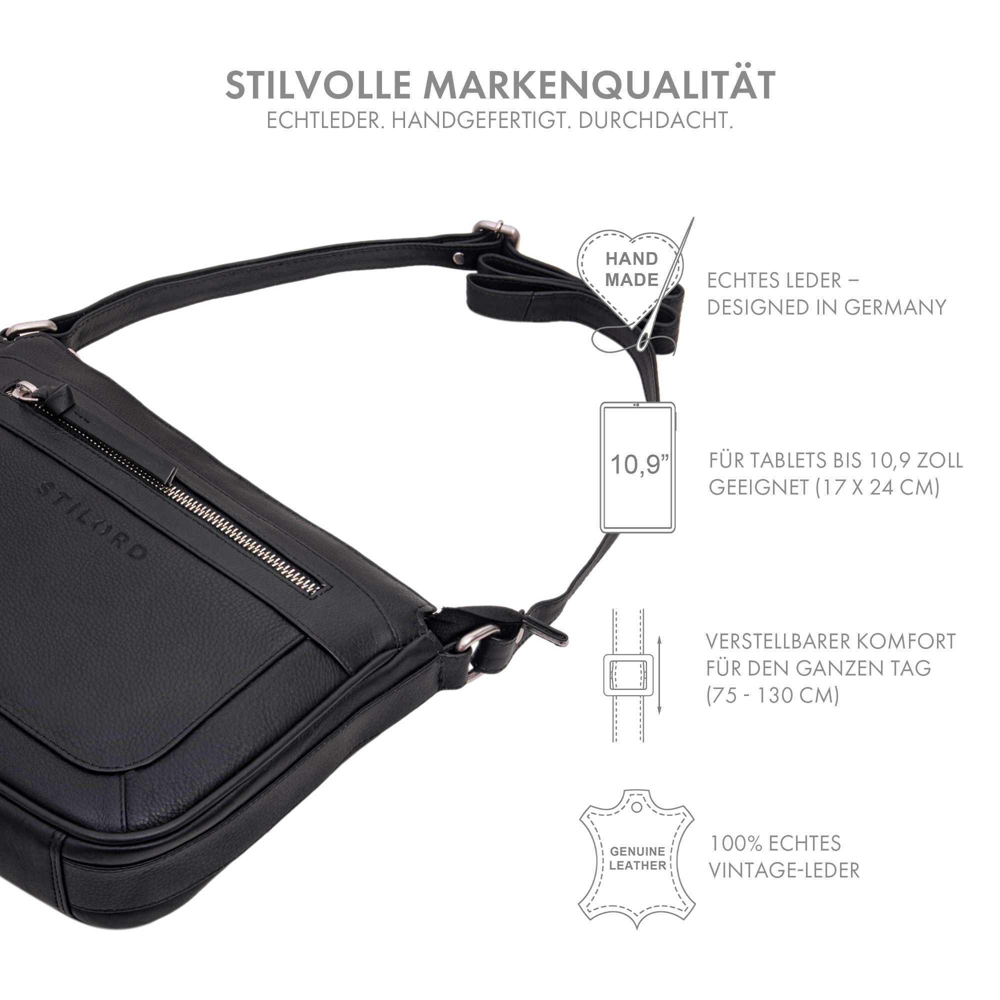 - DETAILS: (LxBxH): 26 x 6 x 21 cm | Modell: "Philine" | Material: Echtes Rindsleder | Gewicht: 400 Gramm | Hersteller: STILORD