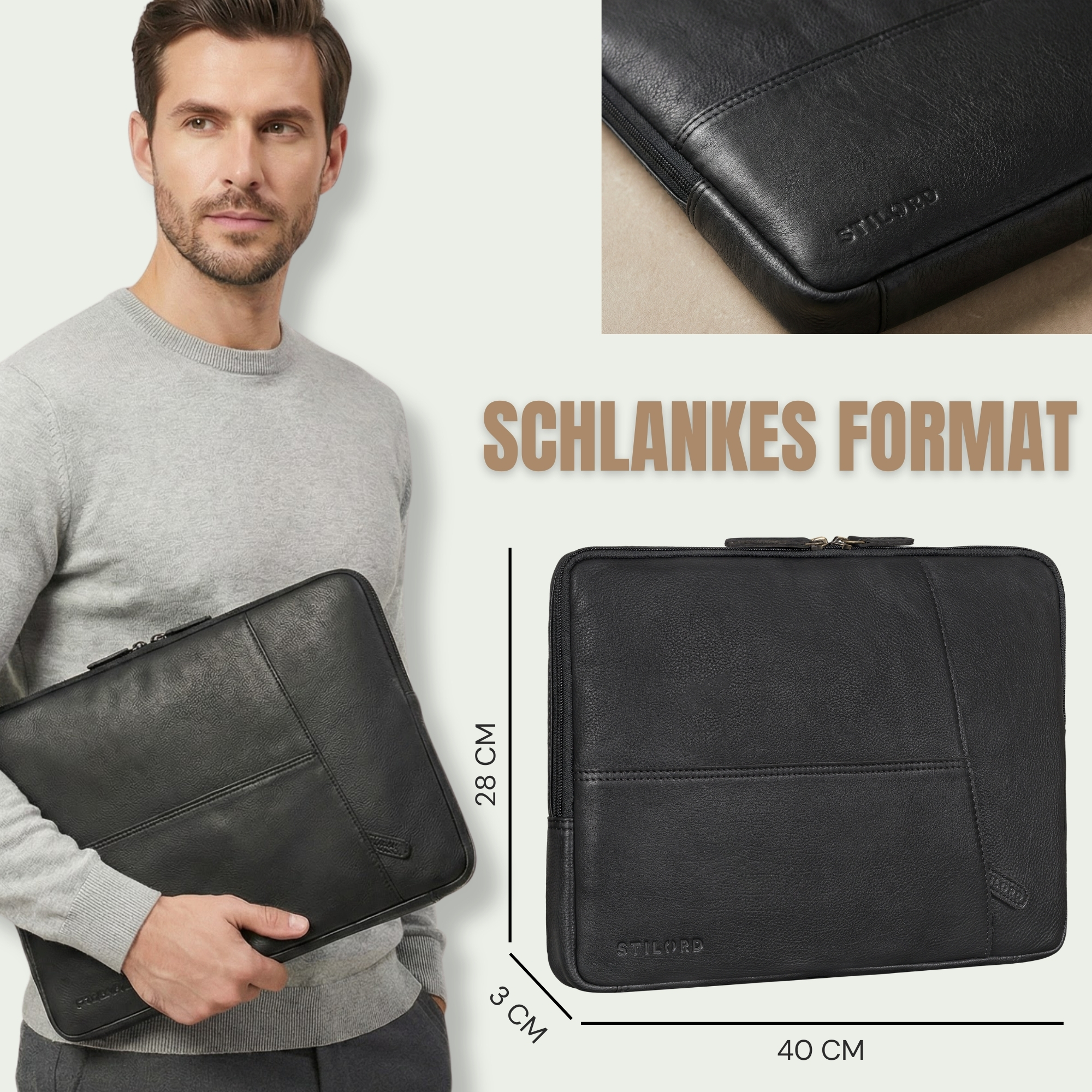 - DETAILS: Maße (LxBxH): ca. 40 x 3 x 28 cm | Gewicht: ca. 490g | Material: Rindsleder | Marke: STILORD | Modell: “Cannes“ | Geeignet für: 15 / 15.6 / 16 Zoll | Hauptfach: 38 x 27 cm | Eigenschaften: gepolstert, wasserabweisend, Anti-Diebstahl Fach, zwei Wege Reißverschluss