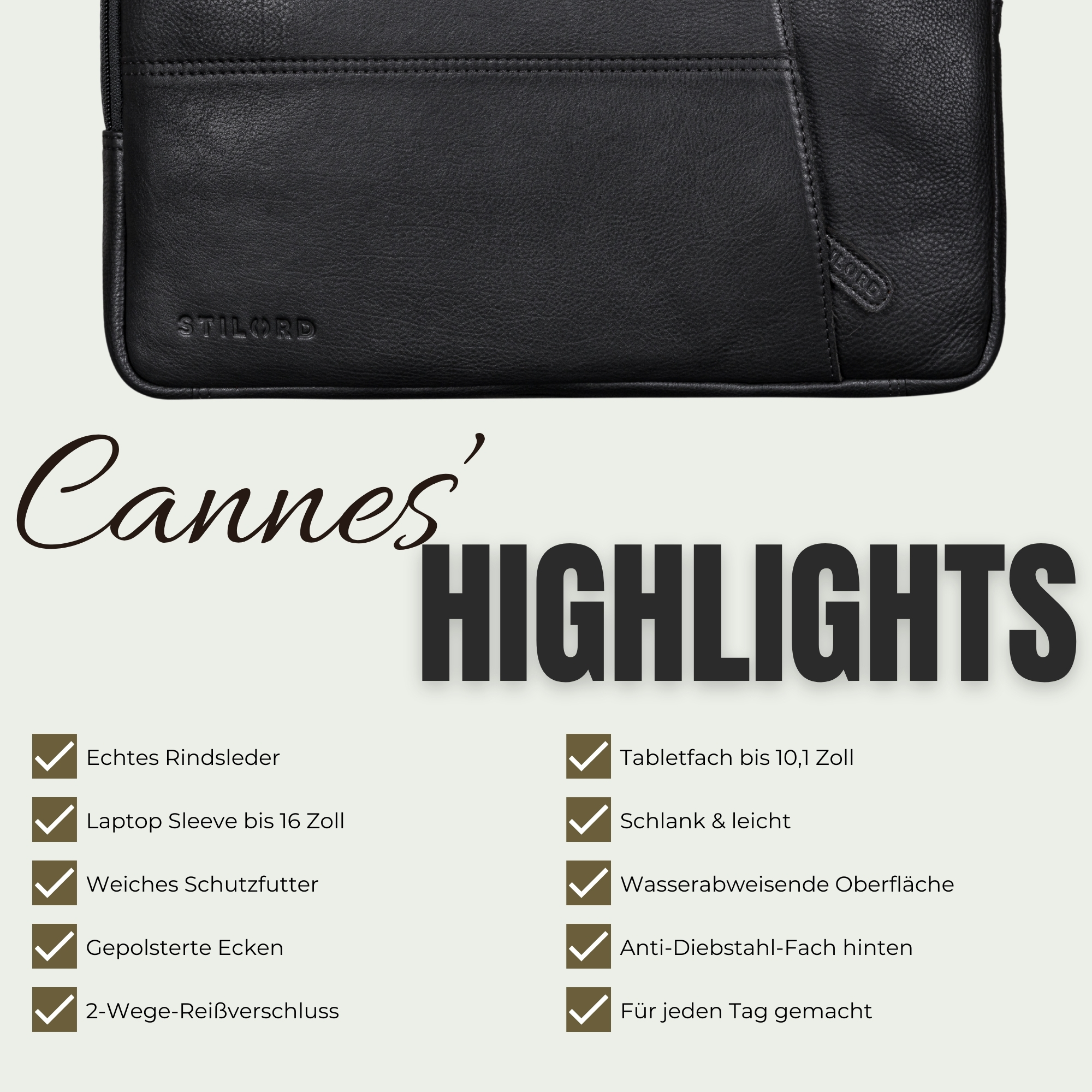• PERFEKT FÜR ARBEIT & UNI: Als Laptop-Tasche 16 Zoll begleitet “Cannes“ zuverlässig durch Büro, Uni und Pendelalltag. Das gefütterte Hauptfach mit gepolsterten Ecken schützt Notebook, Laptop oder MacBook sicher vor Stößen und Kratzern – schlank, leicht und professionell zugleich.