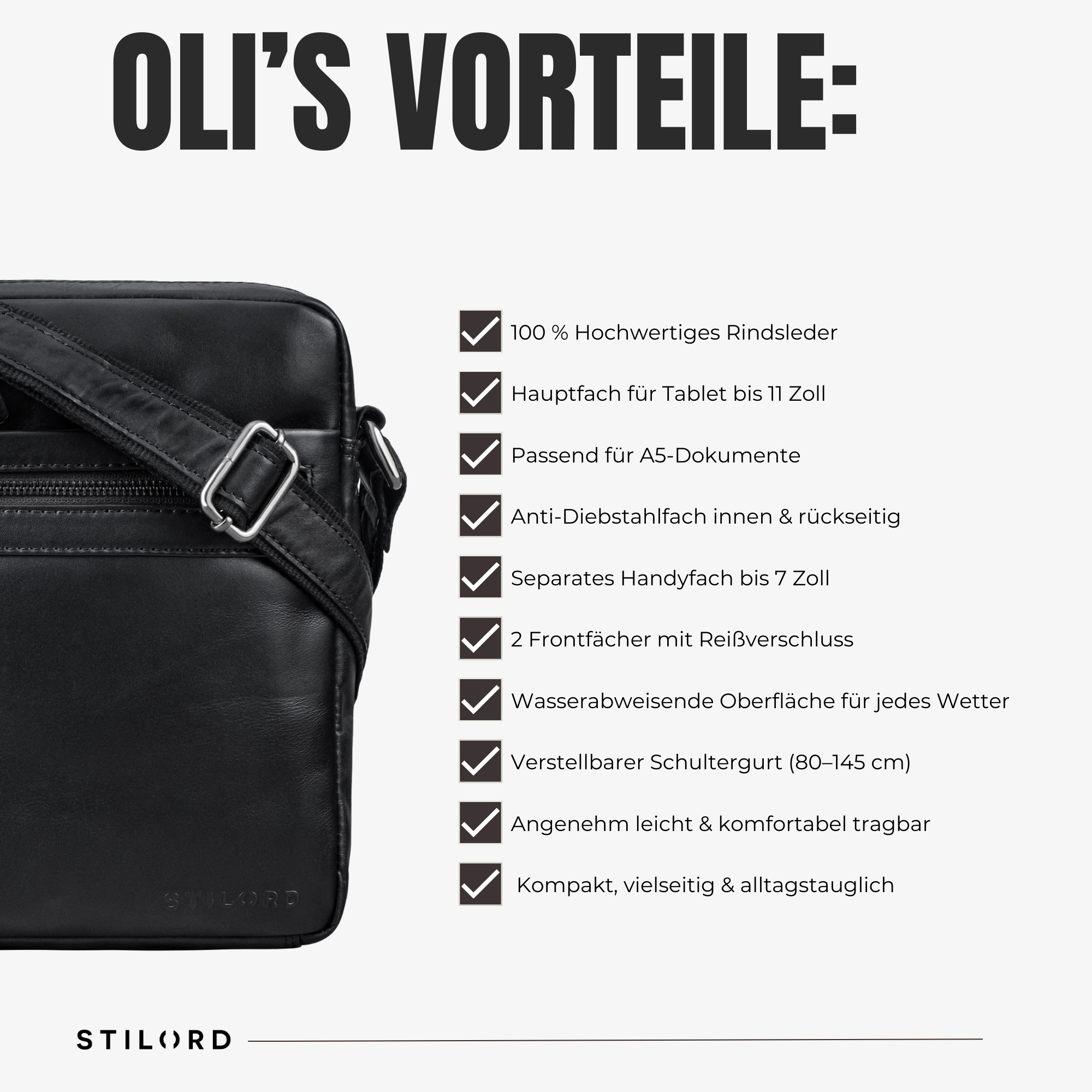 - ALLES AUF EINEN BLICK: Abmessungen: 23 x 5 x 26 cm | Schultergurt: 80 - 145 cm | 3 cm breit | Modell: “Oli” | Material: Rindsleder | Gewicht: 450 Gramm | Marke: STILORD | Kompatibilität: Tablets bis 10 Zoll (25 x 20 cm), DIN A5 Dokumenten