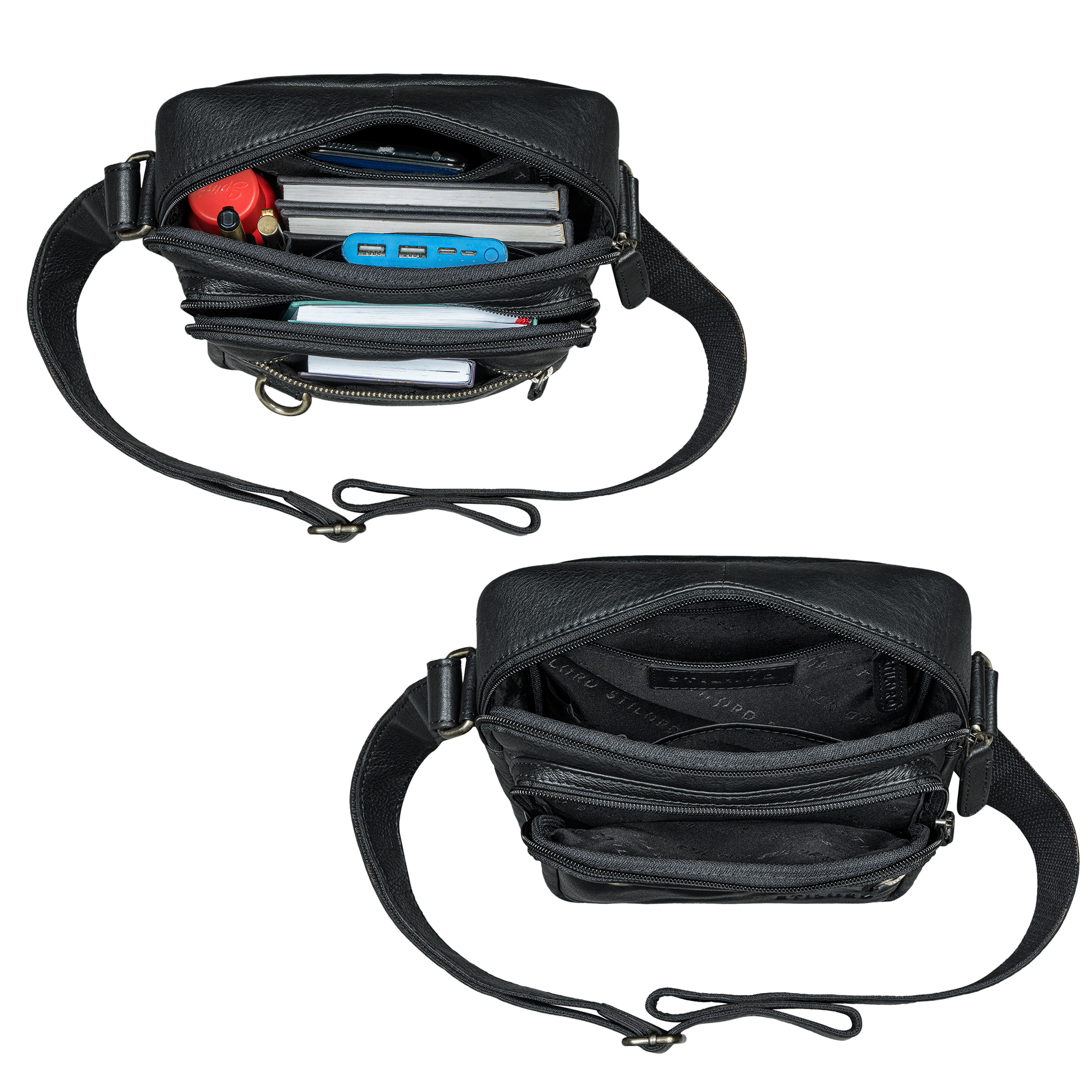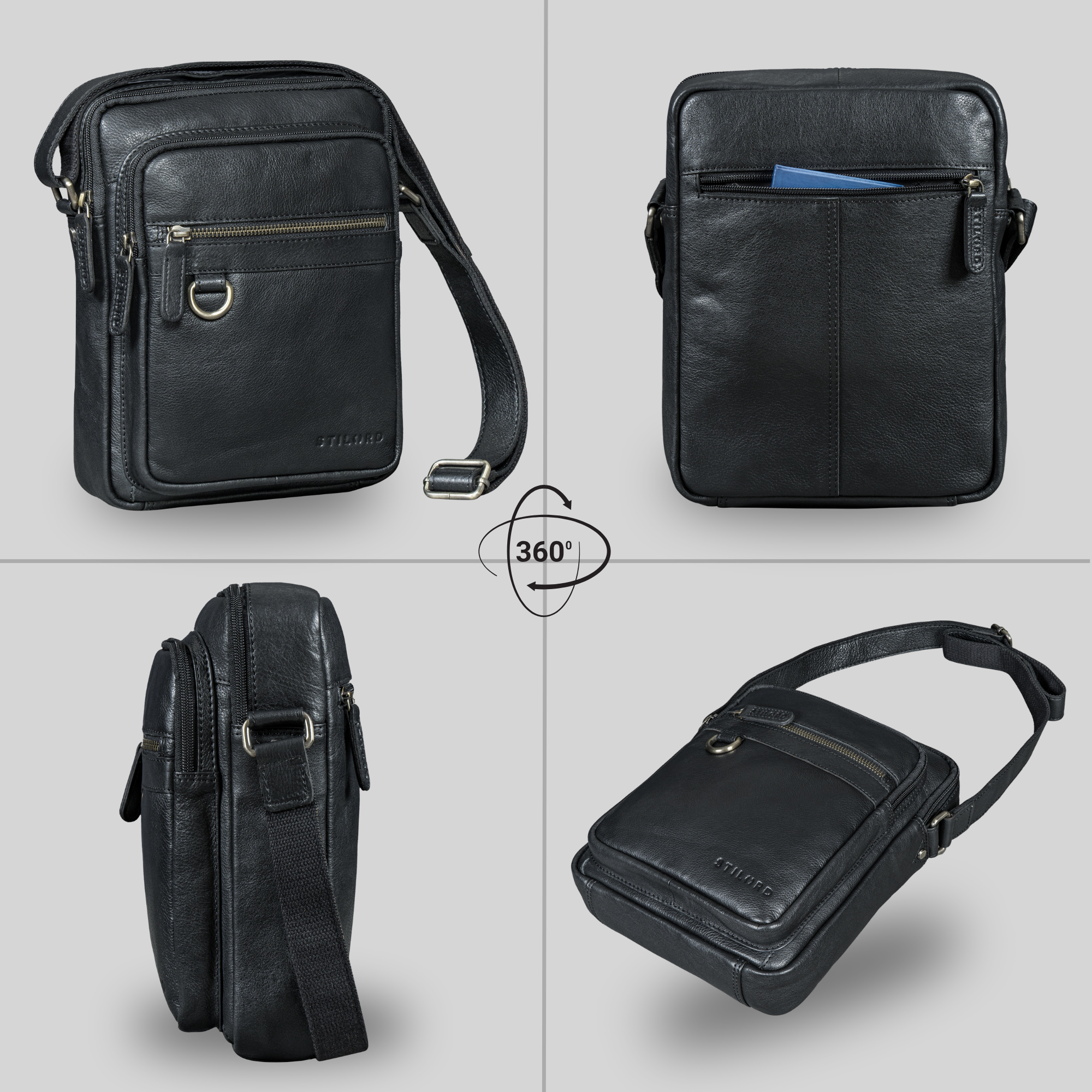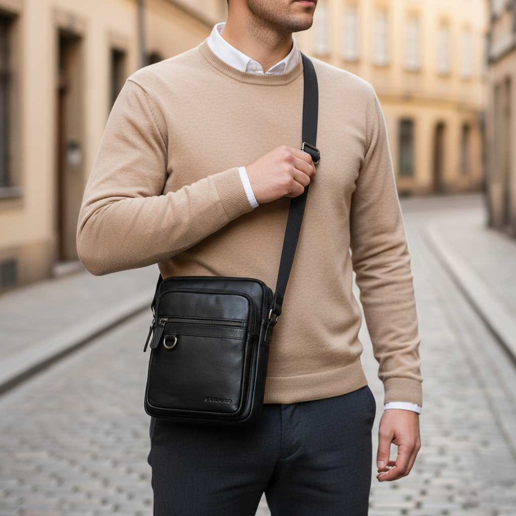 Im Inneren überzeugt die kompakte Echtleder Crossbody Tasche Herren mit Platz für ein iPad bis 10,9 Zoll, DIN A5 Unterlagen und sogar eine 0,5 l Flasche. Mehrere Innen- und Außenfächer sorgen für Ordnung, während das rückseitige Anti-Diebstahlfach Wertsachen besonders sicher aufbewahrt. Ob Crossbody oder klassisch über der Schulter – dank des verstellbaren Gurts tragen Sie “Orion“ immer bequem und individuell.