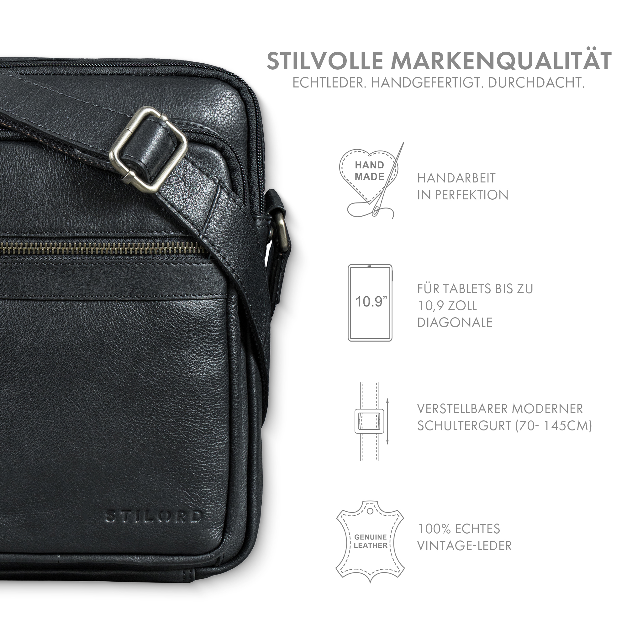 - Abmessungen (L x B x H): 21 x 7 x 31 cm | Gewicht: 530 g | Material: echtes Rindsleder | Hersteller: STILORD | Kompatibilität: iPads bis 10,9 Zoll (18 x 25 cm), DIN A5 Unterlagen & 0,5 l Flasche