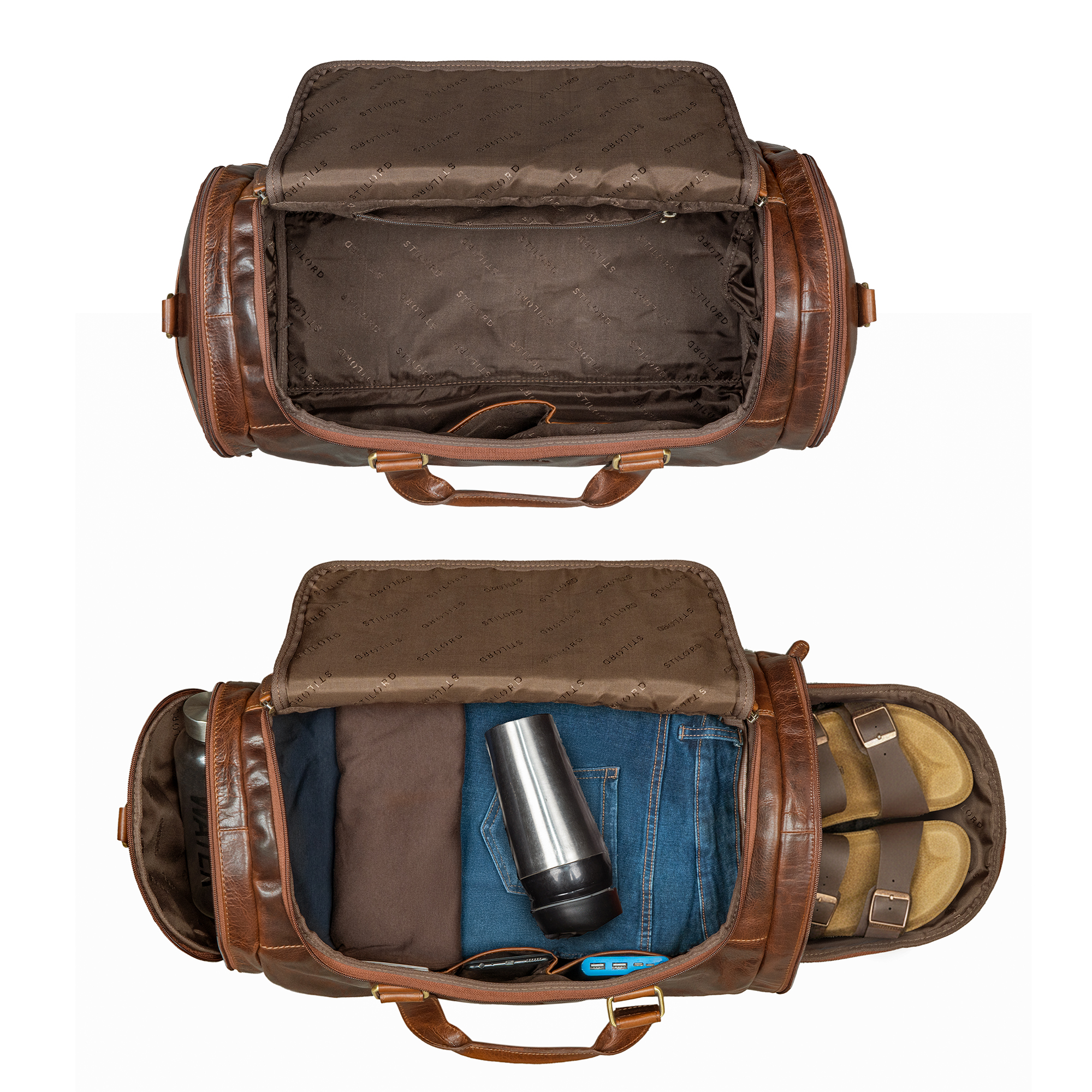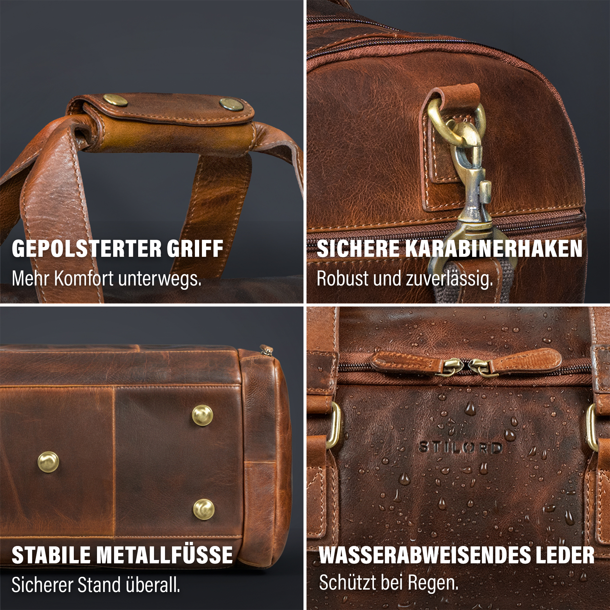 - DETAILS: Maße: 50 x 24 x 25 cm | Gewicht: 1750 g | Material: naturbelassenes Echtleder | Modell: "Salvador" | Marke: STILORD | Kompatibilität: Kleidung, Schuhe, Kulturbeutel, 30L Volumen | Highlights: separates Schuhfach, gepolsterter Griff & Schulterpolster, viele Innenfächer