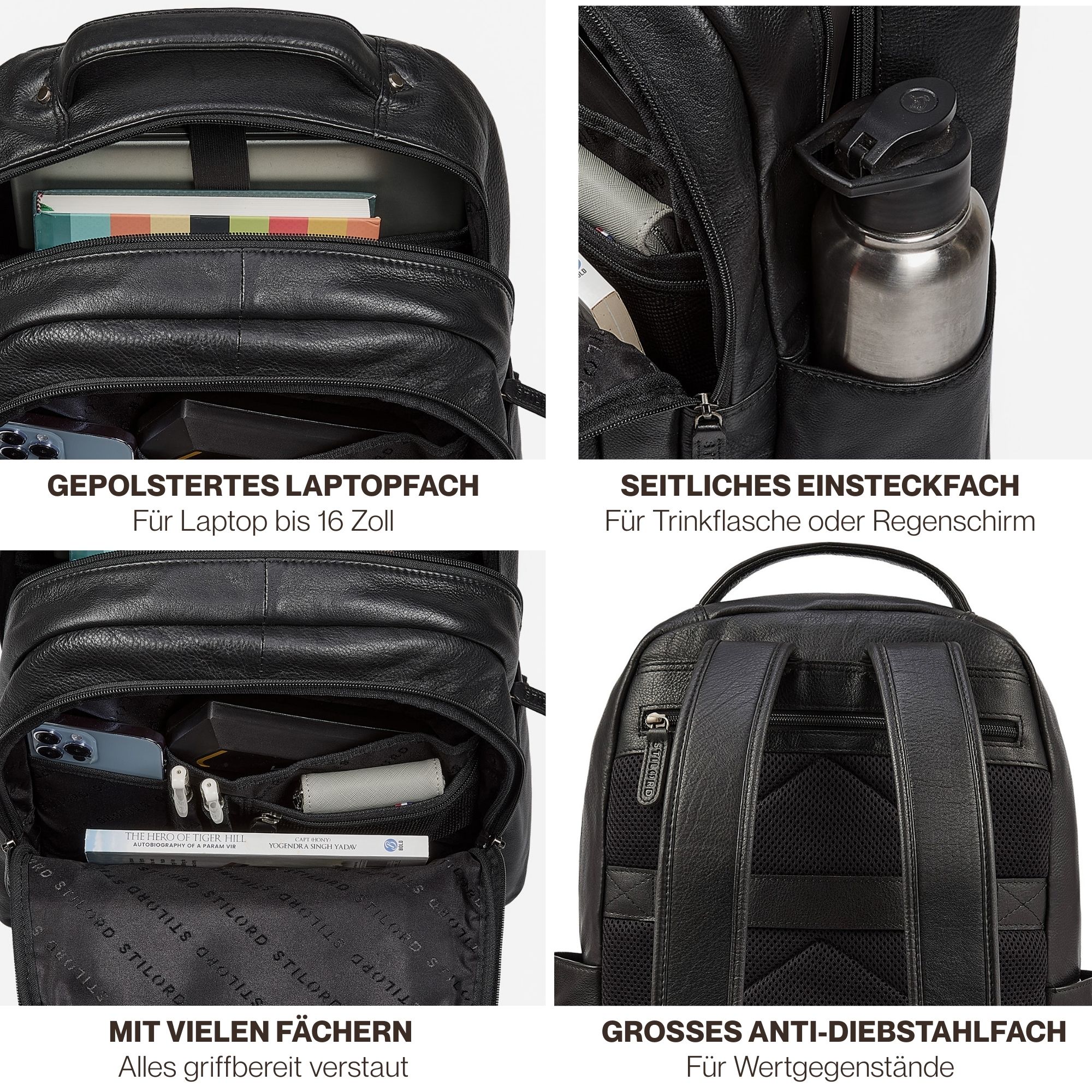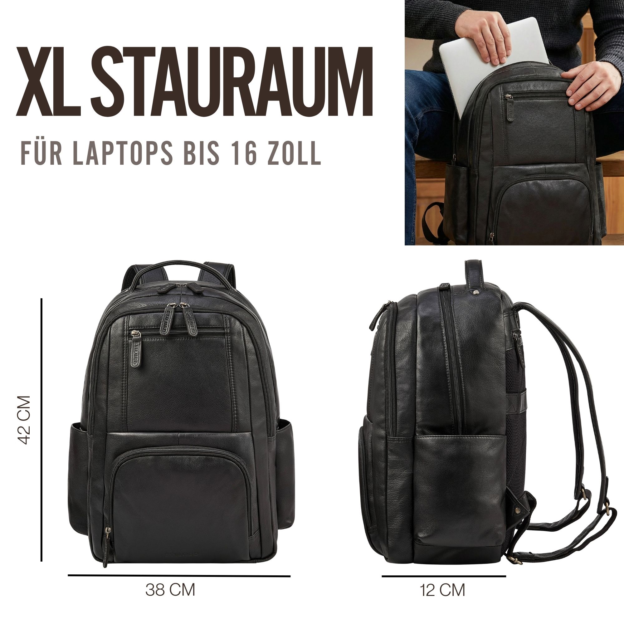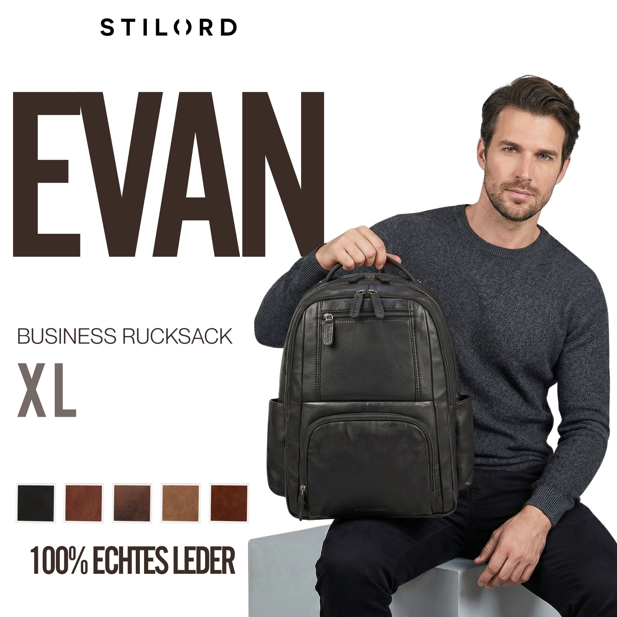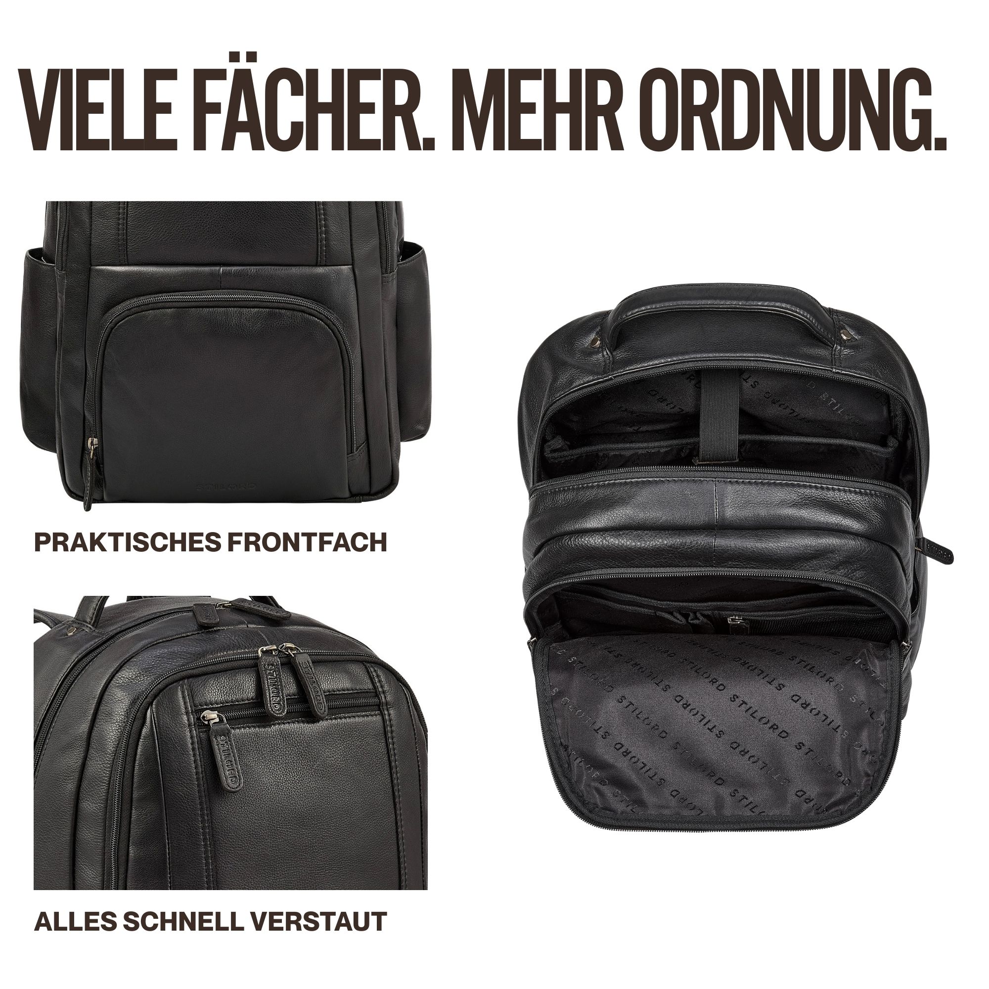 - Maße (LxBxH): ca. 38 x 12 x 42 cm | Gewicht: 1280 g | Modell: "Evan" | Marke: STILORD | Material: Echtleder | Laptopfach: 32 x 40 cm für 16 Zoll