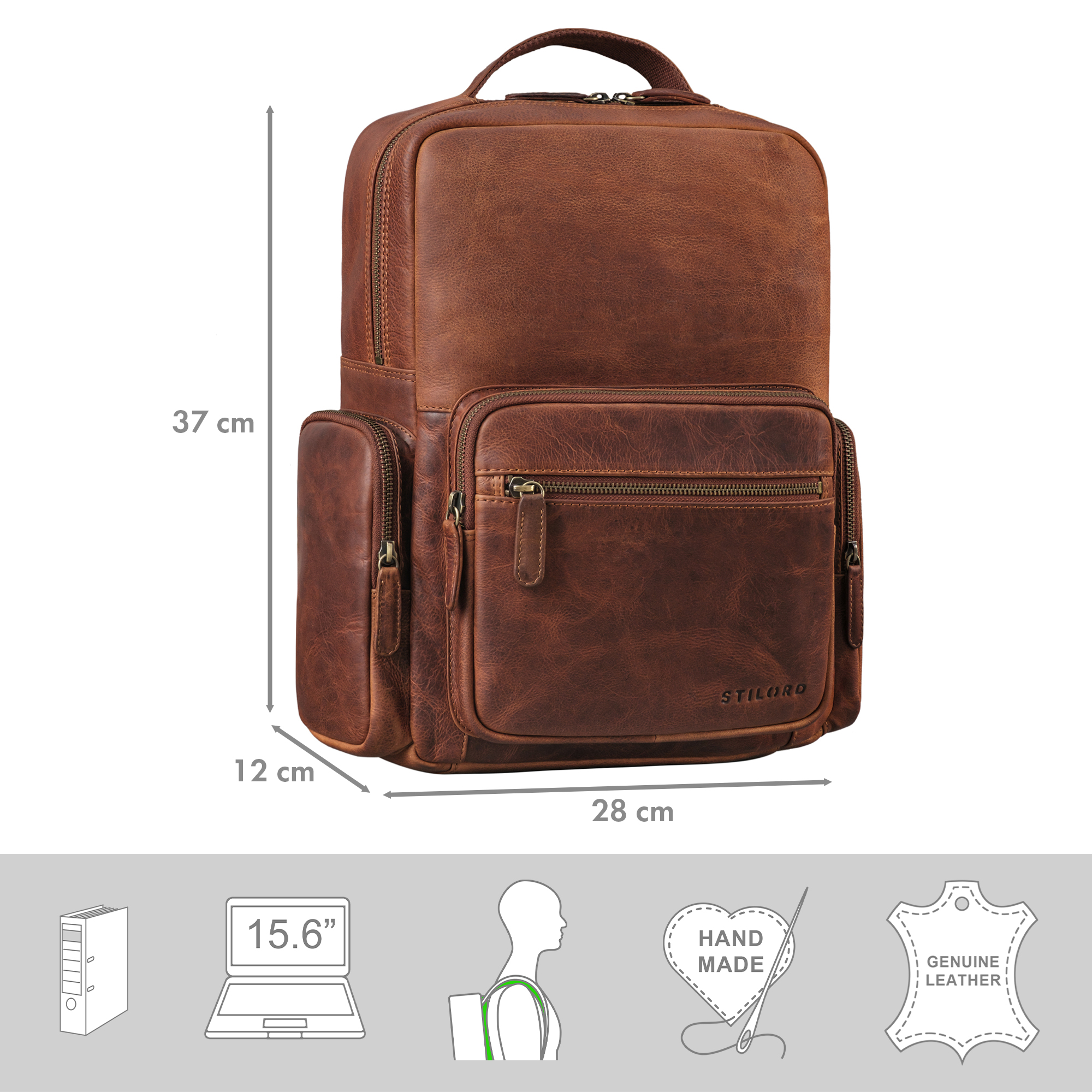 - ALLES AUF EINEN BLICK: Abmessungen: 28 x 12 x 37 cm | Gewicht: 1138 Gramm | Material: Rindsleder | Modell: Polino | Hersteller: STILORD | Kompatibilität: gepolstertes Laptopfach für 15.6 Zoll Laptops und Macbooks mit Abmessungen von 27 x 24 cm (mit Klettverschluss gesichert)