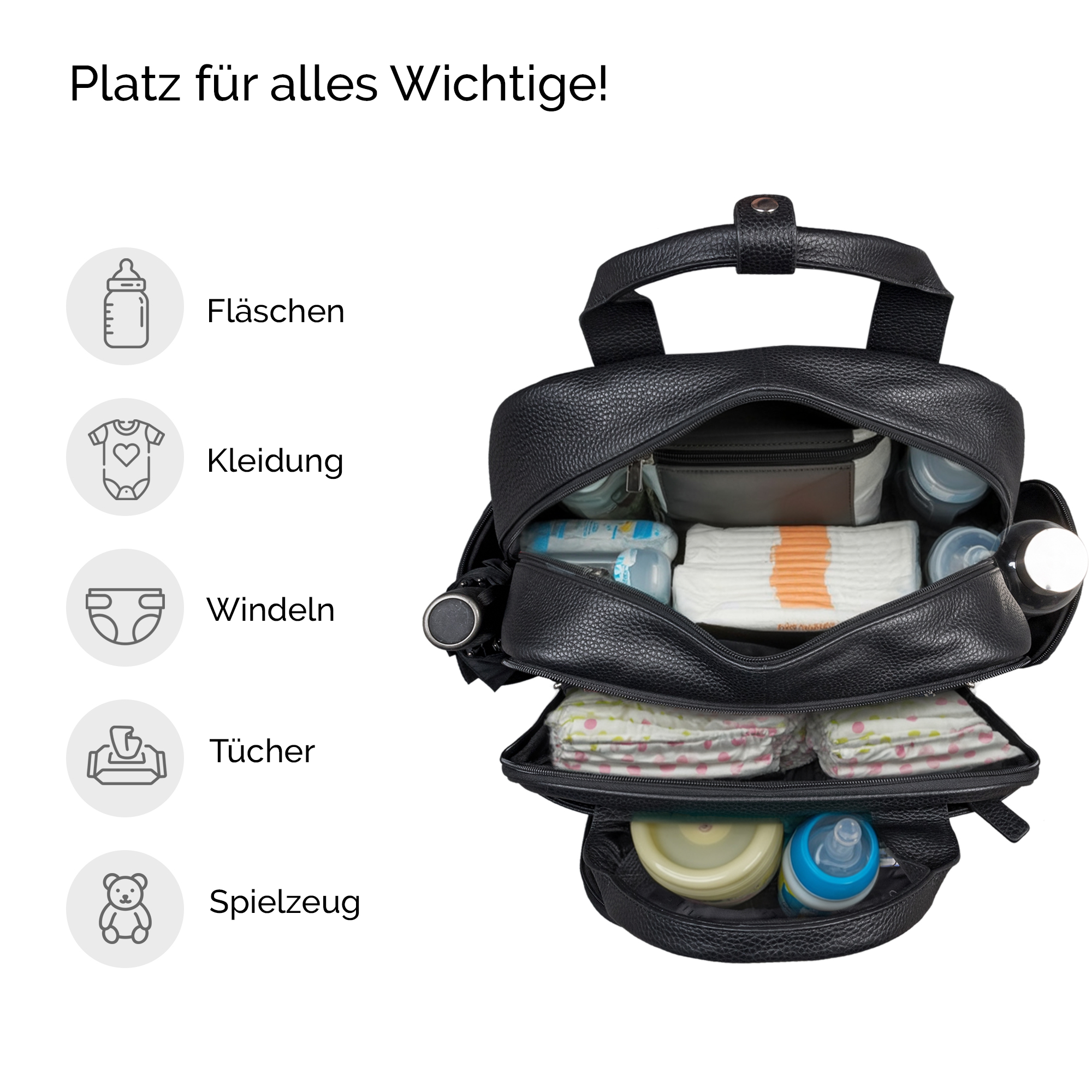 - Großes Hauptfach mit zwei Einsteckfächern für Fläschchen und Windeln