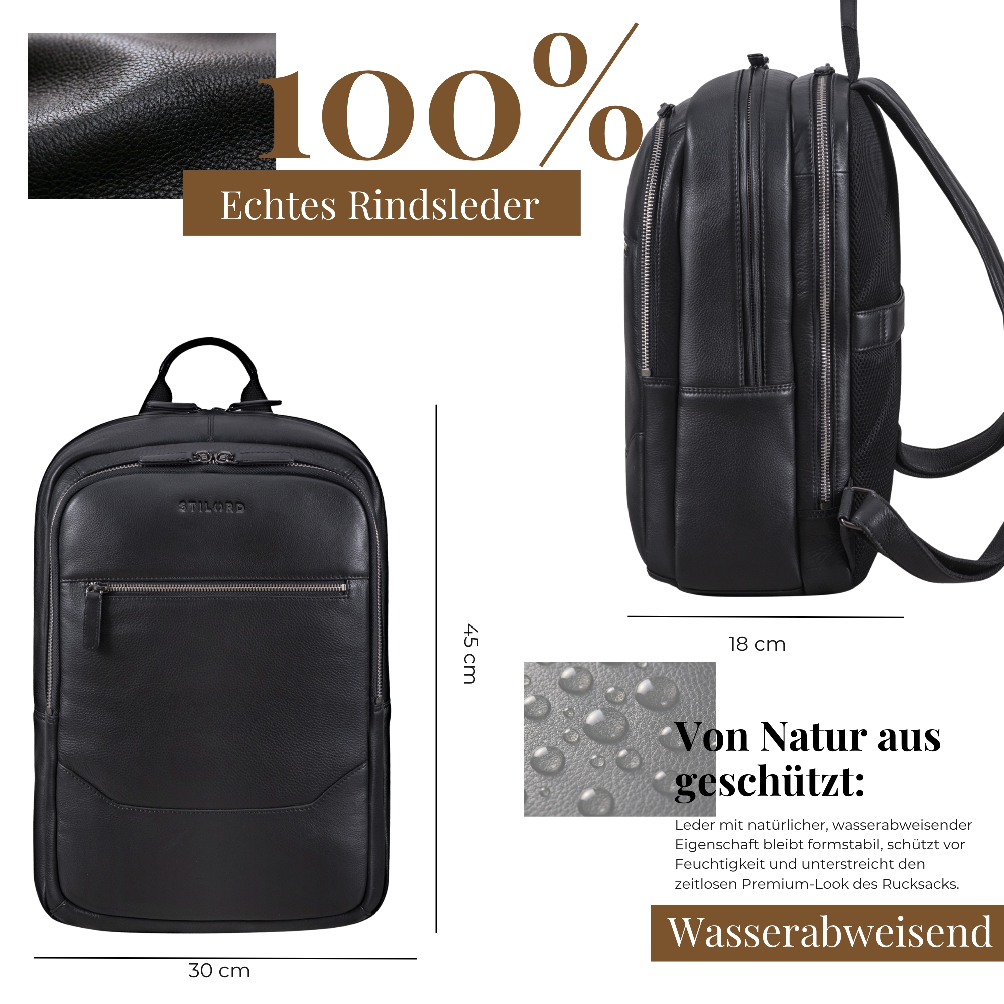 - ALLES AUF EINEN BLICK: Abmessungen (LxBxH): ca. 30 x 18 x 45 cm | Gewicht: 1100 Gramm | Material: Rucksack aus echtem Rindsleder | Marke: STILORD | Kompatibilität: Laptopfächer 16 Zoll (25 x 36 cm) | Hauptfach (ungepolstert) für 17 Zoll Laptops (27 x 40 cm)