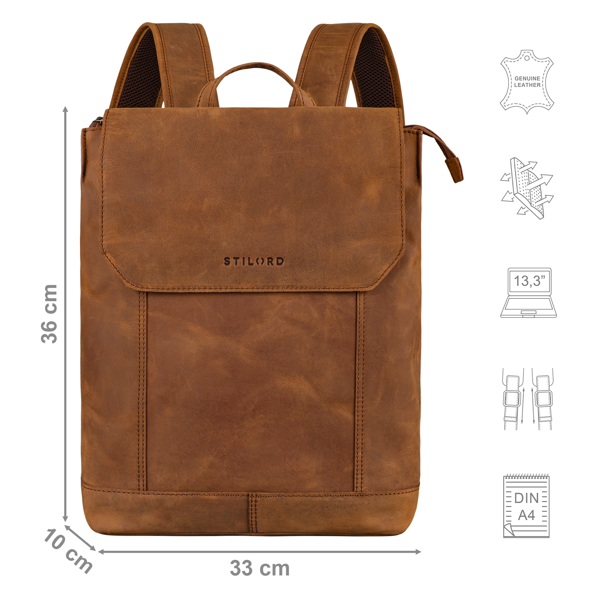 - DETAILS: Maße: ca. 33x36x10 cm | Gewicht: 810 Gramm | Modell: Sage | Material: Echtes Rindsleder | Hersteller: STILORD | Kompatibilität: 13,3 Zoll Laptop / MacBook (gepolstert, ca. 23x30 cm) | Besonderheiten: Atmungsaktiv, verstellbare und gepolsterte Schulterriemen (ca. L 75-95 x B 5 cm), Anti-Diebstahl-Fach auf der Rückseite.