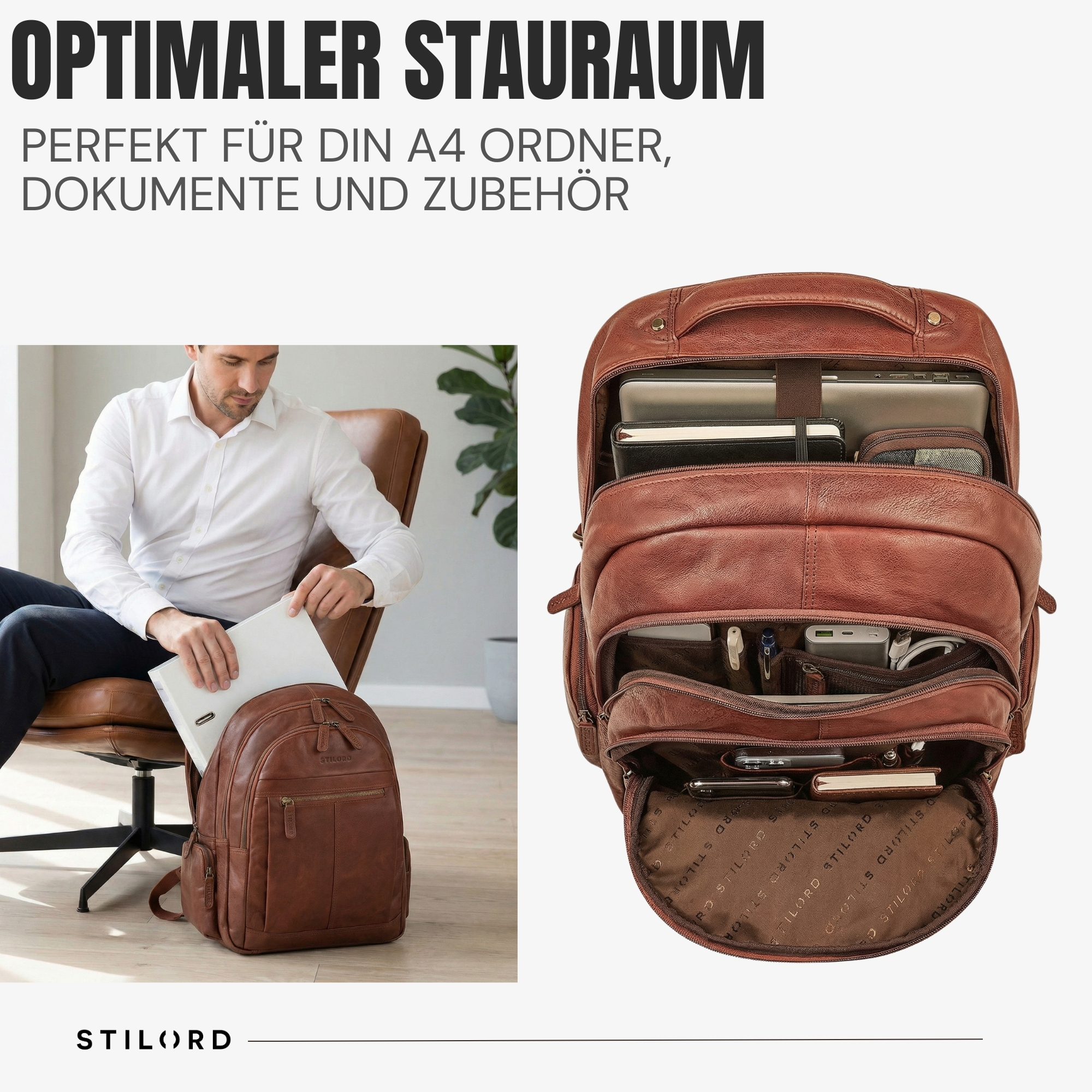 - GERÄUMIGES PLATZWUNDER: Der große Leder Rucksack Herren bietet viel Stauraum für breite DIN-A4-Ordner, Dokumente und Zubehör. Das gepolsterte Laptopfach schützt Notebooks bis 17 Zoll zuverlässig.