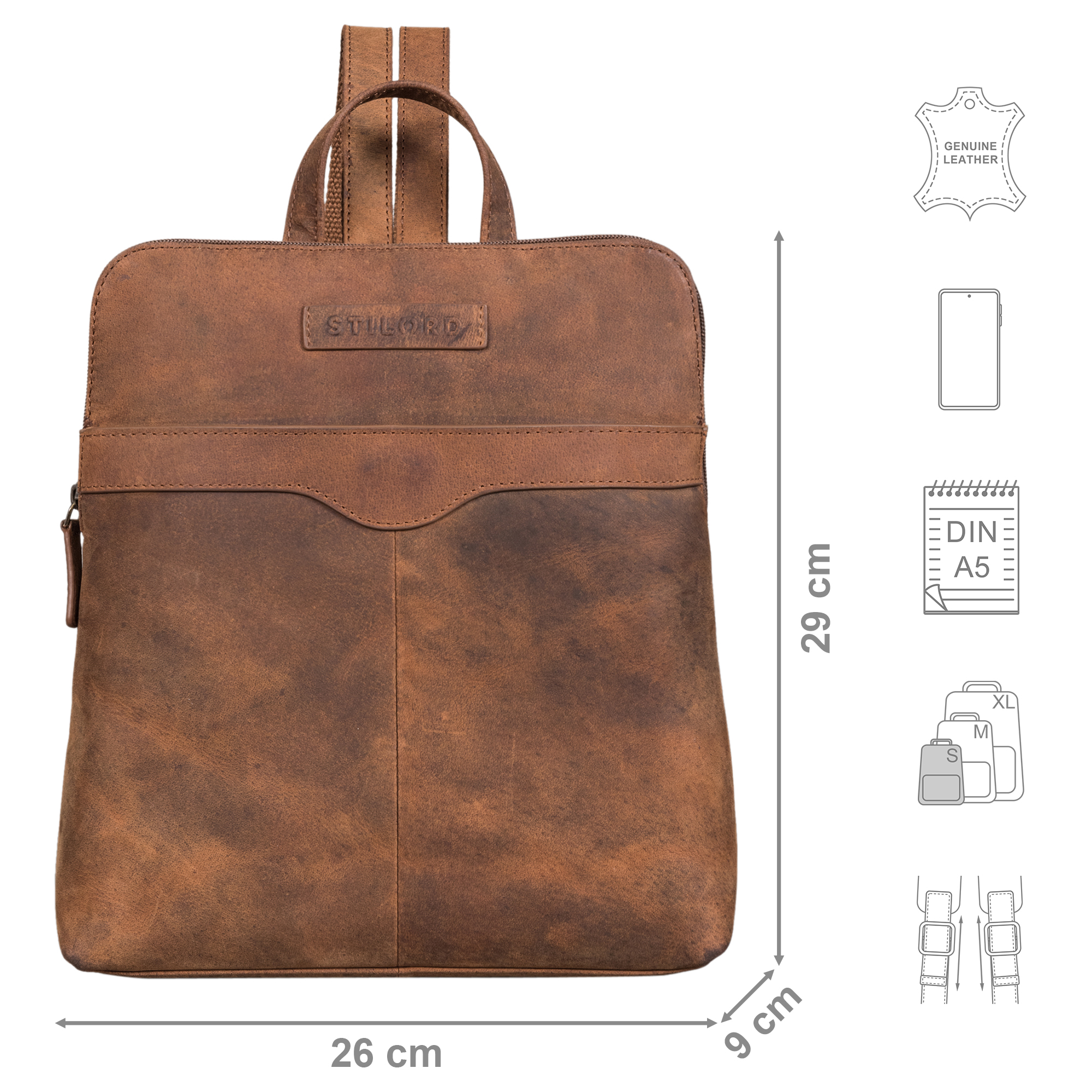 - Echtes Naturprodukt im Vintage Stil: Farbunebenheiten und Kratzer bezeugen die typischen Eigenheiten von echtem Leder, wodurch mit der Zeit jeder Damen-Rucksack zu einem unverwechselbaren Unikat heranreift.