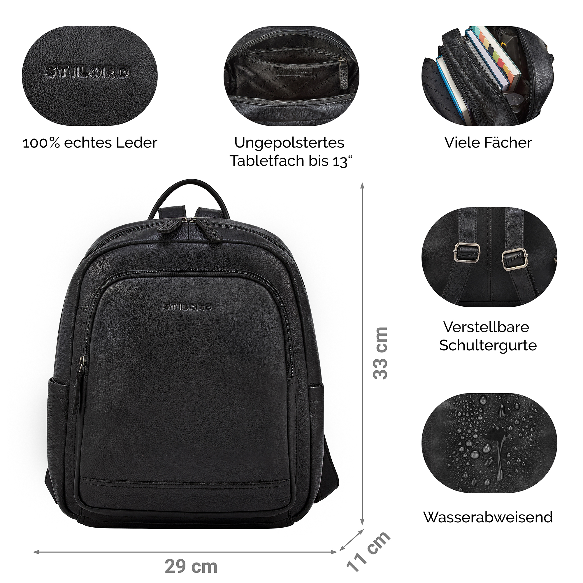 Der STILORD Leder Rucksack für Damen verbindet feminine Eleganz mit praktischer Funktionalität. "Clarissa" ist ein mittelgroßer Damenrucksack, der durch seine kompakte Form und vielen Fächer für perfekte Organisation sorgt. Tablet bis 13 Zoll und schmale DIN A4 Dokumente finden ebenso Platz wie Ihre persönlichen Essentials – ideal für Beruf, Uni oder Freizeit.